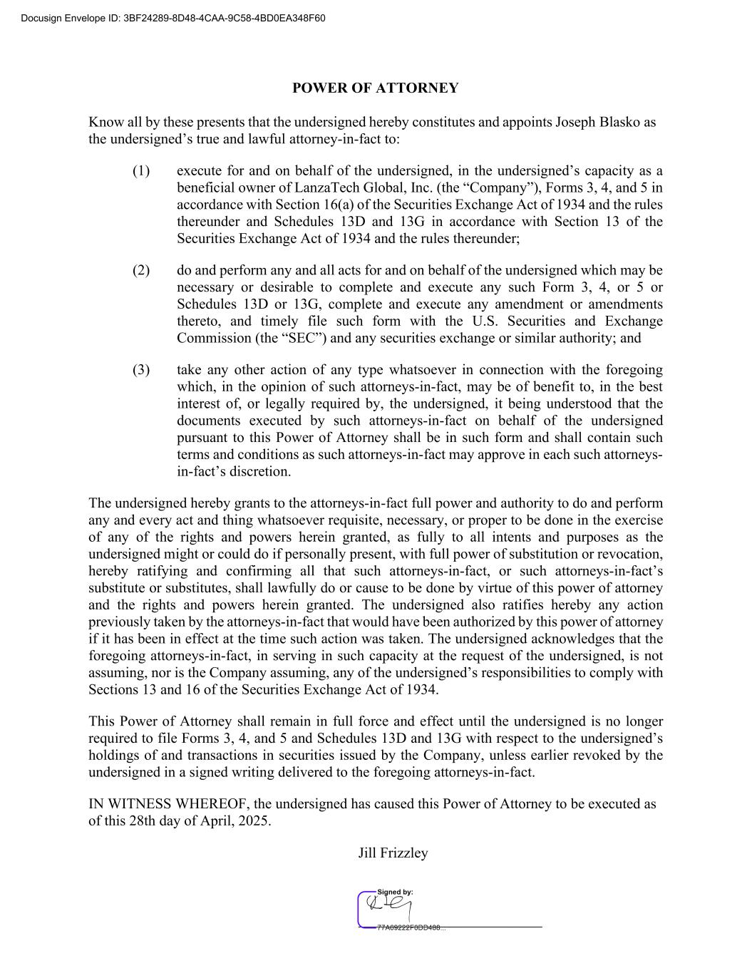 POWER OF ATTORNEY Know all by these presents that the undersigned hereby constitutes and appoints Joseph Blasko as the undersigned’s true and lawful attorney-in-fact to: (1) execute for and on behalf of the undersigned, in the undersigned’s capacity as a beneficial owner of LanzaTech Global, Inc. (the “Company”), Forms 3, 4, and 5 in accordance with Section 16(a) of the Securities Exchange Act of 1934 and the rules thereunder and Schedules 13D and 13G in accordance with Section 13 of the Securities Exchange Act of 1934 and the rules thereunder; (2) do and perform any and all acts for and on behalf of the undersigned which may be necessary or desirable to complete and execute any such Form 3, 4, or 5 or Schedules 13D or 13G, complete and execute any amendment or amendments thereto, and timely file such form with the U.S. Securities and Exchange Commission (the “SEC”) and any securities exchange or similar authority; and (3) take any other action of any type whatsoever in connection with the foregoing which, in the opinion of such attorneys-in-fact, may be of benefit to, in the best interest of, or legally required by, the undersigned, it being understood that the documents executed by such attorneys-in-fact on behalf of the undersigned pursuant to this Power of Attorney shall be in such form and shall contain such terms and conditions as such attorneys-in-fact may approve in each such attorneys- in-fact’s discretion. The undersigned hereby grants to the attorneys-in-fact full power and authority to do and perform any and every act and thing whatsoever requisite, necessary, or proper to be done in the exercise of any of the rights and powers herein granted, as fully to all intents and purposes as the undersigned might or could do if personally present, with full power of substitution or revocation, hereby ratifying and confirming all that such attorneys-in-fact, or such attorneys-in-fact’s substitute or substitutes, shall lawfully do or cause to be done by virtue of this power of attorney and the rights and powers herein granted. The undersigned also ratifies hereby any action previously taken by the attorneys-in-fact that would have been authorized by this power of attorney if it has been in effect at the time such action was taken. The undersigned acknowledges that the foregoing attorneys-in-fact, in serving in such capacity at the request of the undersigned, is not assuming, nor is the Company assuming, any of the undersigned’s responsibilities to comply with Sections 13 and 16 of the Securities Exchange Act of 1934. This Power of Attorney shall remain in full force and effect until the undersigned is no longer required to file Forms 3, 4, and 5 and Schedules 13D and 13G with respect to the undersigned’s holdings of and transactions in securities issued by the Company, unless earlier revoked by the undersigned in a signed writing delivered to the foregoing attorneys-in-fact. IN WITNESS WHEREOF, the undersigned has caused this Power of Attorney to be executed as of this 28th day of April, 2025. Jill Frizzley _________________________ Docusign Envelope ID: 3BF24289-8D48-4CAA-9C58-4BD0EA348F60