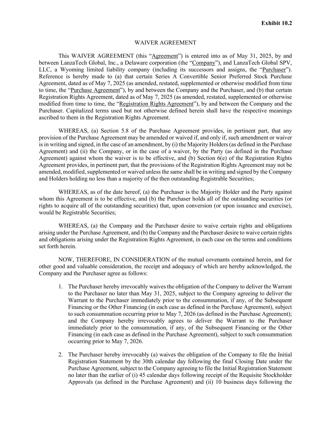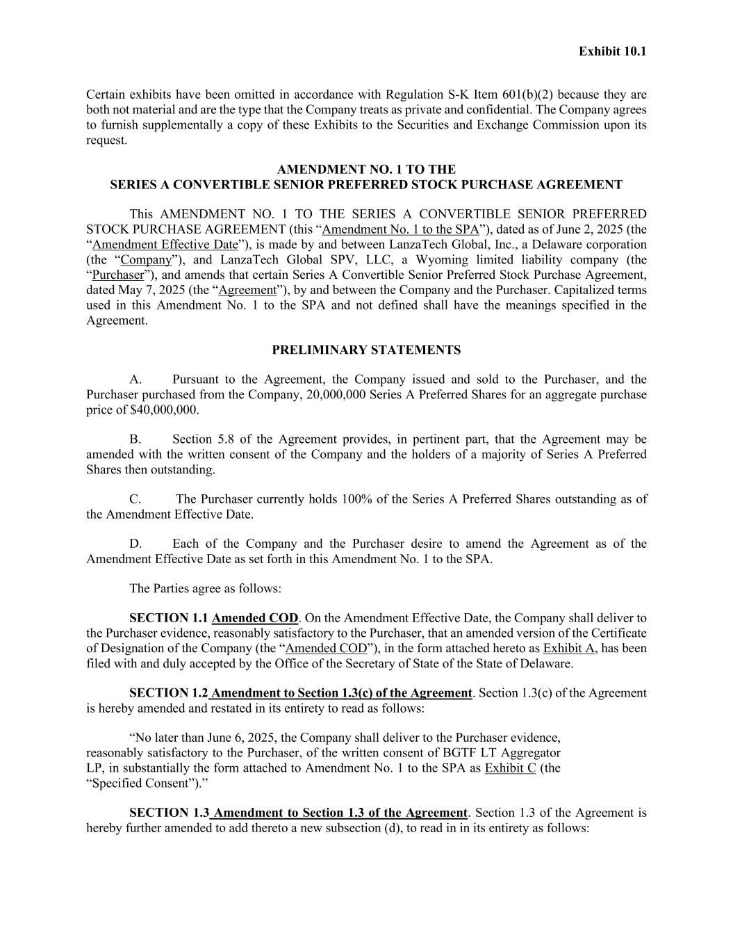 Exhibit 10.1 Certain exhibits have been omitted in accordance with Regulation S-K Item 601(b)(2) because they are both not material and are the type that the Company treats as private and confidential. The Company agrees to furnish supplementally a copy of these Exhibits to the Securities and Exchange Commission upon its request. AMENDMENT NO. 1 TO THE SERIES A CONVERTIBLE SENIOR PREFERRED STOCK PURCHASE AGREEMENT This AMENDMENT NO. 1 TO THE SERIES A CONVERTIBLE SENIOR PREFERRED STOCK PURCHASE AGREEMENT (this “Amendment No. 1 to the SPA”), dated as of June 2, 2025 (the “Amendment Effective Date”), is made by and between LanzaTech Global, Inc., a Delaware corporation (the “Company”), and LanzaTech Global SPV, LLC, a Wyoming limited liability company (the “Purchaser”), and amends that certain Series A Convertible Senior Preferred Stock Purchase Agreement, dated May 7, 2025 (the “Agreement”), by and between the Company and the Purchaser. Capitalized terms used in this Amendment No. 1 to the SPA and not defined shall have the meanings specified in the Agreement. PRELIMINARY STATEMENTS A. Pursuant to the Agreement, the Company issued and sold to the Purchaser, and the Purchaser purchased from the Company, 20,000,000 Series A Preferred Shares for an aggregate purchase price of $40,000,000. B. Section 5.8 of the Agreement provides, in pertinent part, that the Agreement may be amended with the written consent of the Company and the holders of a majority of Series A Preferred Shares then outstanding. C. The Purchaser currently holds 100% of the Series A Preferred Shares outstanding as of the Amendment Effective Date. D. Each of the Company and the Purchaser desire to amend the Agreement as of the Amendment Effective Date as set forth in this Amendment No. 1 to the SPA. The Parties agree as follows: SECTION 1.1 Amended COD. On the Amendment Effective Date, the Company shall deliver to the Purchaser evidence, reasonably satisfactory to the Purchaser, that an amended version of the Certificate of Designation of the Company (the “Amended COD”), in the form attached hereto as Exhibit A, has been filed with and duly accepted by the Office of the Secretary of State of the State of Delaware. SECTION 1.2 Amendment to Section 1.3(c) of the Agreement. Section 1.3(c) of the Agreement is hereby amended and restated in its entirety to read as follows: “No later than June 6, 2025, the Company shall deliver to the Purchaser evidence, reasonably satisfactory to the Purchaser, of the written consent of BGTF LT Aggregator LP, in substantially the form attached to Amendment No. 1 to the SPA as Exhibit C (the “Specified Consent”).” SECTION 1.3 Amendment to Section 1.3 of the Agreement. Section 1.3 of the Agreement is hereby further amended to add thereto a new subsection (d), to read in in its entirety as follows: