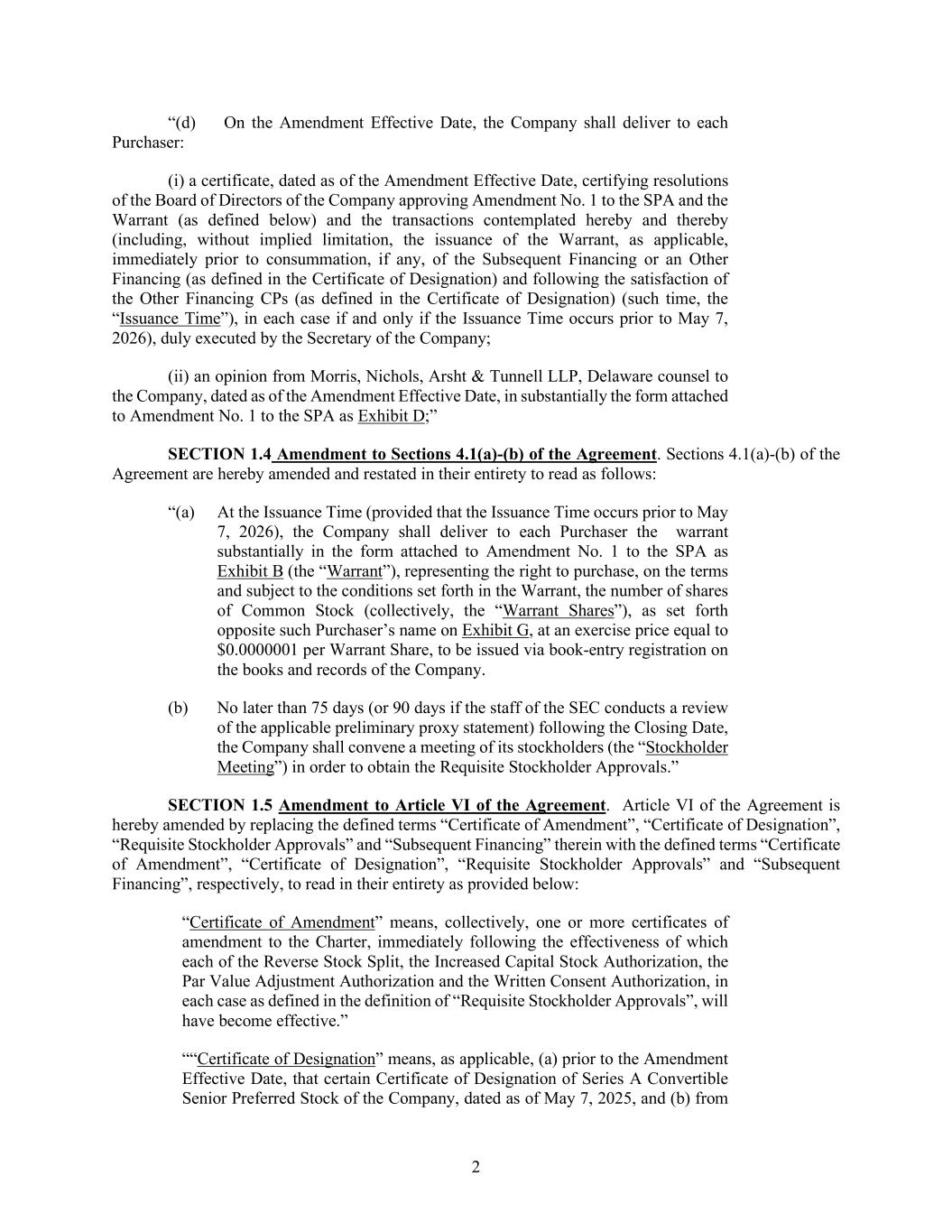 2 “(d) On the Amendment Effective Date, the Company shall deliver to each Purchaser: (i) a certificate, dated as of the Amendment Effective Date, certifying resolutions of the Board of Directors of the Company approving Amendment No. 1 to the SPA and the Warrant (as defined below) and the transactions contemplated hereby and thereby (including, without implied limitation, the issuance of the Warrant, as applicable, immediately prior to consummation, if any, of the Subsequent Financing or an Other Financing (as defined in the Certificate of Designation) and following the satisfaction of the Other Financing CPs (as defined in the Certificate of Designation) (such time, the “Issuance Time”), in each case if and only if the Issuance Time occurs prior to May 7, 2026), duly executed by the Secretary of the Company; (ii) an opinion from Morris, Nichols, Arsht & Tunnell LLP, Delaware counsel to the Company, dated as of the Amendment Effective Date, in substantially the form attached to Amendment No. 1 to the SPA as Exhibit D;” SECTION 1.4 Amendment to Sections 4.1(a)-(b) of the Agreement. Sections 4.1(a)-(b) of the Agreement are hereby amended and restated in their entirety to read as follows: “(a) At the Issuance Time (provided that the Issuance Time occurs prior to May 7, 2026), the Company shall deliver to each Purchaser the warrant substantially in the form attached to Amendment No. 1 to the SPA as Exhibit B (the “Warrant”), representing the right to purchase, on the terms and subject to the conditions set forth in the Warrant, the number of shares of Common Stock (collectively, the “Warrant Shares”), as set forth opposite such Purchaser’s name on Exhibit G, at an exercise price equal to $0.0000001 per Warrant Share, to be issued via book-entry registration on the books and records of the Company. (b) No later than 75 days (or 90 days if the staff of the SEC conducts a review of the applicable preliminary proxy statement) following the Closing Date, the Company shall convene a meeting of its stockholders (the “Stockholder Meeting”) in order to obtain the Requisite Stockholder Approvals.” SECTION 1.5 Amendment to Article VI of the Agreement. Article VI of the Agreement is hereby amended by replacing the defined terms “Certificate of Amendment”, “Certificate of Designation”, “Requisite Stockholder Approvals” and “Subsequent Financing” therein with the defined terms “Certificate of Amendment”, “Certificate of Designation”, “Requisite Stockholder Approvals” and “Subsequent Financing”, respectively, to read in their entirety as provided below: “Certificate of Amendment” means, collectively, one or more certificates of amendment to the Charter, immediately following the effectiveness of which each of the Reverse Stock Split, the Increased Capital Stock Authorization, the Par Value Adjustment Authorization and the Written Consent Authorization, in each case as defined in the definition of “Requisite Stockholder Approvals”, will have become effective.” ““Certificate of Designation” means, as applicable, (a) prior to the Amendment Effective Date, that certain Certificate of Designation of Series A Convertible Senior Preferred Stock of the Company, dated as of May 7, 2025, and (b) from