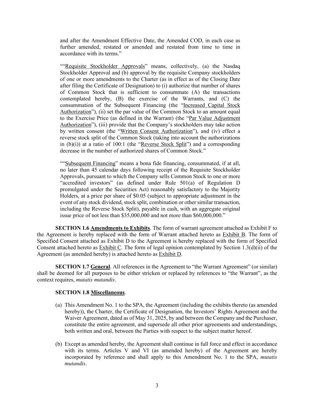 3 and after the Amendment Effective Date, the Amended COD, in each case as further amended, restated or amended and restated from time to time in accordance with its terms.” ““Requisite Stockholder Approvals” means, collectively, (a) the Nasdaq Stockholder Approval and (b) approval by the requisite Company stockholders of one or more amendments to the Charter (as in effect as of the Closing Date after filing the Certificate of Designation) to (i) authorize that number of shares of Common Stock that is sufficient to consummate (A) the transactions contemplated hereby, (B) the exercise of the Warrants, and (C) the consummation of the Subsequent Financing (the “Increased Capital Stock Authorization”), (ii) set the par value of the Common Stock to an amount equal to the Exercise Price (as defined in the Warrant) (the “Par Value Adjustment Authorization”), (iii) provide that the Company’s stockholders may take action by written consent (the “Written Consent Authorization”), and (iv) effect a reverse stock split of the Common Stock (taking into account the authorizations in (b)(i)) at a ratio of 100:1 (the “Reverse Stock Split”) and a corresponding decrease in the number of authorized shares of Common Stock.” ““Subsequent Financing” means a bona fide financing, consummated, if at all, no later than 45 calendar days following receipt of the Requisite Stockholder Approvals, pursuant to which the Company sells Common Stock to one or more “accredited investors” (as defined under Rule 501(a) of Regulation D promulgated under the Securities Act) reasonably satisfactory to the Majority Holders, at a price per share of $0.05 (subject to appropriate adjustment in the event of any stock dividend, stock split, combination or other similar transaction, including the Reverse Stock Split), payable in cash, with an aggregate original issue price of not less than $35,000,000 and not more than $60,000,000.” SECTION 1.6 Amendments to Exhibits. The form of warrant agreement attached as Exhibit F to the Agreement is hereby replaced with the form of Warrant attached hereto as Exhibit B. The form of Specified Consent attached as Exhibit D to the Agreement is hereby replaced with the form of Specified Consent attached hereto as Exhibit C. The form of legal opinion contemplated by Section 1.3(d)(ii) of the Agreement (as amended hereby) is attached hereto as Exhibit D. SECTION 1.7 General. All references in the Agreement to “the Warrant Agreement” (or similar) shall be deemed for all purposes to be either stricken or replaced by references to “the Warrant”, as the context requires, mutatis mutandis. SECTION 1.8 Miscellaneous. (a) This Amendment No. 1 to the SPA, the Agreement (including the exhibits thereto (as amended hereby)), the Charter, the Certificate of Designation, the Investors’ Rights Agreement and the Waiver Agreement, dated as of May 31, 2025, by and between the Company and the Purchaser, constitute the entire agreement, and supersede all other prior agreements and understandings, both written and oral, between the Parties with respect to the subject matter hereof. (b) Except as amended hereby, the Agreement shall continue in full force and effect in accordance with its terms. Articles V and VI (as amended hereby) of the Agreement are hereby incorporated by reference and shall apply to this Amendment No. 1 to the SPA, mutatis mutandis.