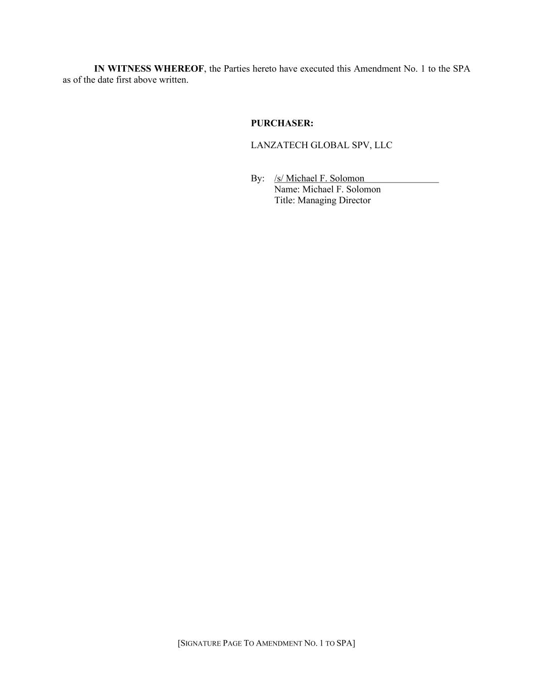 [SIGNATURE PAGE TO AMENDMENT NO. 1 TO SPA] IN WITNESS WHEREOF, the Parties hereto have executed this Amendment No. 1 to the SPA as of the date first above written. PURCHASER: LANZATECH GLOBAL SPV, LLC By: /s/ Michael F. Solomon Name: Michael F. Solomon Title: Managing Director