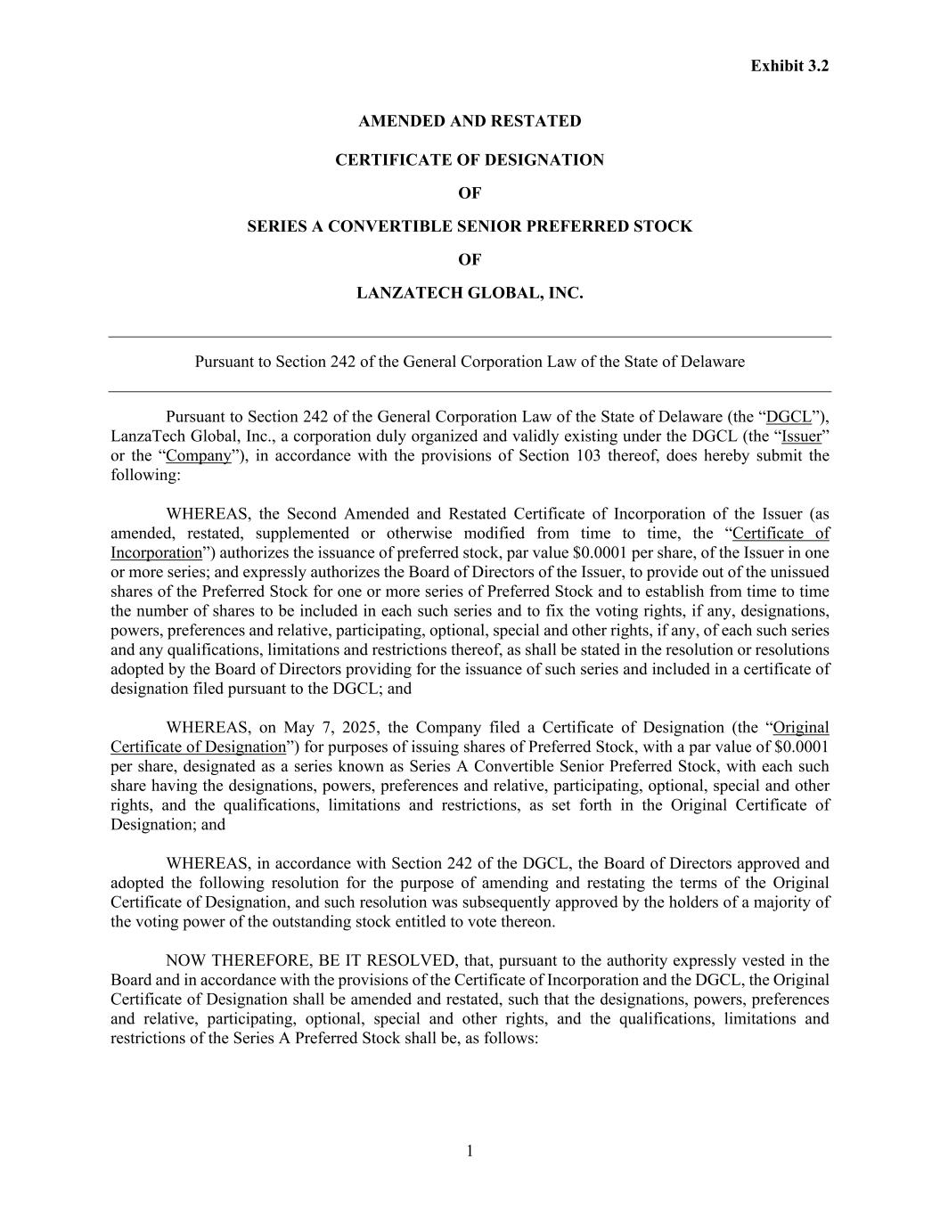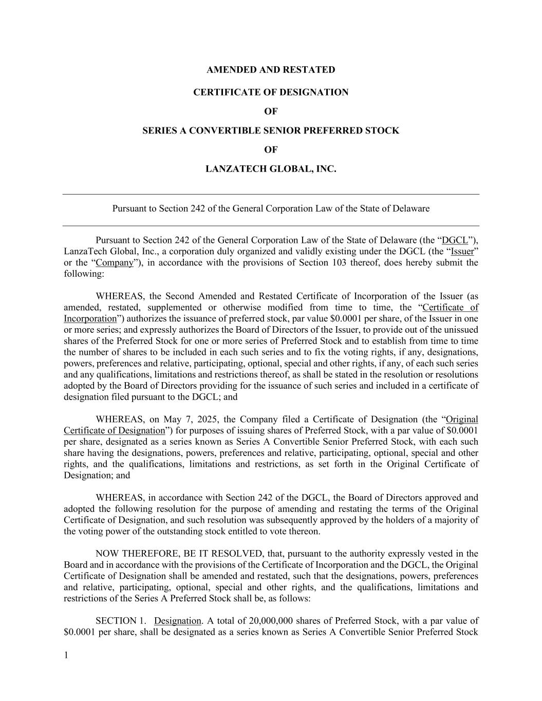 1 AMENDED AND RESTATED CERTIFICATE OF DESIGNATION OF SERIES A CONVERTIBLE SENIOR PREFERRED STOCK OF LANZATECH GLOBAL, INC. Pursuant to Section 242 of the General Corporation Law of the State of Delaware Pursuant to Section 242 of the General Corporation Law of the State of Delaware (the “DGCL”), LanzaTech Global, Inc., a corporation duly organized and validly existing under the DGCL (the “Issuer” or the “Company”), in accordance with the provisions of Section 103 thereof, does hereby submit the following: WHEREAS, the Second Amended and Restated Certificate of Incorporation of the Issuer (as amended, restated, supplemented or otherwise modified from time to time, the “Certificate of Incorporation”) authorizes the issuance of preferred stock, par value $0.0001 per share, of the Issuer in one or more series; and expressly authorizes the Board of Directors of the Issuer, to provide out of the unissued shares of the Preferred Stock for one or more series of Preferred Stock and to establish from time to time the number of shares to be included in each such series and to fix the voting rights, if any, designations, powers, preferences and relative, participating, optional, special and other rights, if any, of each such series and any qualifications, limitations and restrictions thereof, as shall be stated in the resolution or resolutions adopted by the Board of Directors providing for the issuance of such series and included in a certificate of designation filed pursuant to the DGCL; and WHEREAS, on May 7, 2025, the Company filed a Certificate of Designation (the “Original Certificate of Designation”) for purposes of issuing shares of Preferred Stock, with a par value of $0.0001 per share, designated as a series known as Series A Convertible Senior Preferred Stock, with each such share having the designations, powers, preferences and relative, participating, optional, special and other rights, and the qualifications, limitations and restrictions, as set forth in the Original Certificate of Designation; and WHEREAS, in accordance with Section 242 of the DGCL, the Board of Directors approved and adopted the following resolution for the purpose of amending and restating the terms of the Original Certificate of Designation, and such resolution was subsequently approved by the holders of a majority of the voting power of the outstanding stock entitled to vote thereon. NOW THEREFORE, BE IT RESOLVED, that, pursuant to the authority expressly vested in the Board and in accordance with the provisions of the Certificate of Incorporation and the DGCL, the Original Certificate of Designation shall be amended and restated, such that the designations, powers, preferences and relative, participating, optional, special and other rights, and the qualifications, limitations and restrictions of the Series A Preferred Stock shall be, as follows: SECTION 1. Designation. A total of 20,000,000 shares of Preferred Stock, with a par value of $0.0001 per share, shall be designated as a series known as Series A Convertible Senior Preferred Stock