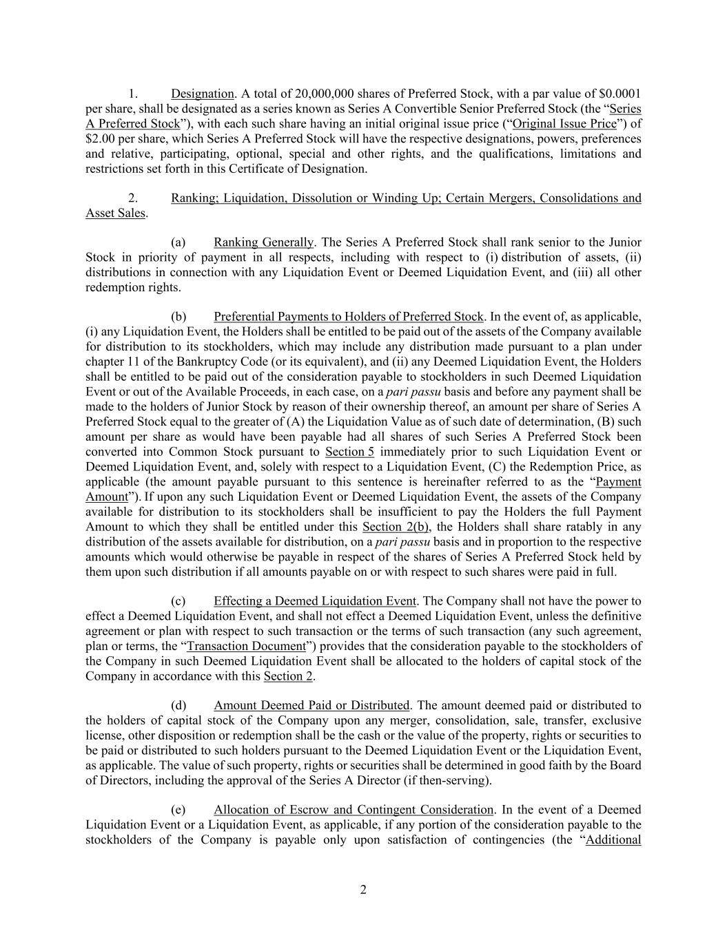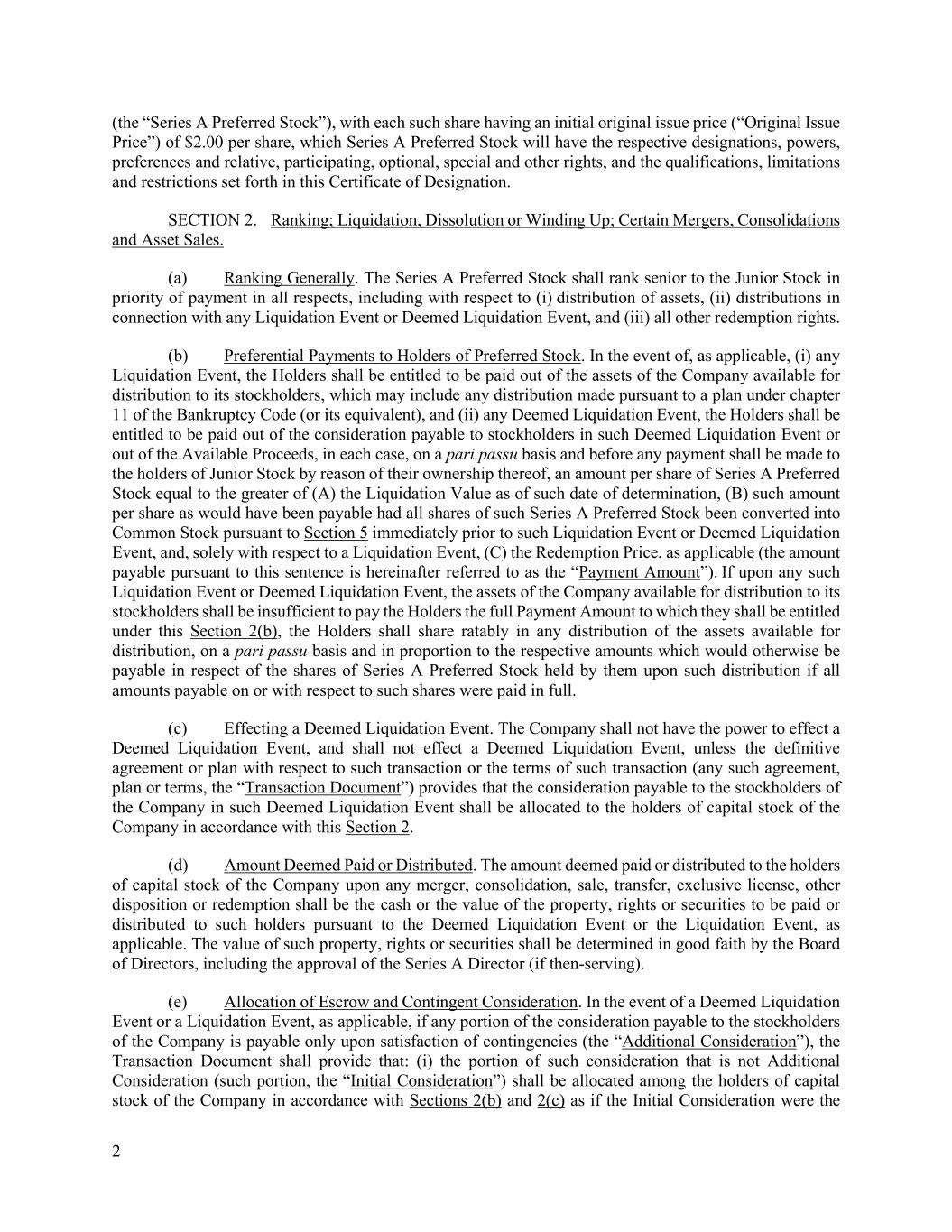 2 (the “Series A Preferred Stock”), with each such share having an initial original issue price (“Original Issue Price”) of $2.00 per share, which Series A Preferred Stock will have the respective designations, powers, preferences and relative, participating, optional, special and other rights, and the qualifications, limitations and restrictions set forth in this Certificate of Designation. SECTION 2. Ranking; Liquidation, Dissolution or Winding Up; Certain Mergers, Consolidations and Asset Sales. (a) Ranking Generally. The Series A Preferred Stock shall rank senior to the Junior Stock in priority of payment in all respects, including with respect to (i) distribution of assets, (ii) distributions in connection with any Liquidation Event or Deemed Liquidation Event, and (iii) all other redemption rights. (b) Preferential Payments to Holders of Preferred Stock. In the event of, as applicable, (i) any Liquidation Event, the Holders shall be entitled to be paid out of the assets of the Company available for distribution to its stockholders, which may include any distribution made pursuant to a plan under chapter 11 of the Bankruptcy Code (or its equivalent), and (ii) any Deemed Liquidation Event, the Holders shall be entitled to be paid out of the consideration payable to stockholders in such Deemed Liquidation Event or out of the Available Proceeds, in each case, on a pari passu basis and before any payment shall be made to the holders of Junior Stock by reason of their ownership thereof, an amount per share of Series A Preferred Stock equal to the greater of (A) the Liquidation Value as of such date of determination, (B) such amount per share as would have been payable had all shares of such Series A Preferred Stock been converted into Common Stock pursuant to Section 5 immediately prior to such Liquidation Event or Deemed Liquidation Event, and, solely with respect to a Liquidation Event, (C) the Redemption Price, as applicable (the amount payable pursuant to this sentence is hereinafter referred to as the “Payment Amount”). If upon any such Liquidation Event or Deemed Liquidation Event, the assets of the Company available for distribution to its stockholders shall be insufficient to pay the Holders the full Payment Amount to which they shall be entitled under this Section 2(b), the Holders shall share ratably in any distribution of the assets available for distribution, on a pari passu basis and in proportion to the respective amounts which would otherwise be payable in respect of the shares of Series A Preferred Stock held by them upon such distribution if all amounts payable on or with respect to such shares were paid in full. (c) Effecting a Deemed Liquidation Event. The Company shall not have the power to effect a Deemed Liquidation Event, and shall not effect a Deemed Liquidation Event, unless the definitive agreement or plan with respect to such transaction or the terms of such transaction (any such agreement, plan or terms, the “Transaction Document”) provides that the consideration payable to the stockholders of the Company in such Deemed Liquidation Event shall be allocated to the holders of capital stock of the Company in accordance with this Section 2. (d) Amount Deemed Paid or Distributed. The amount deemed paid or distributed to the holders of capital stock of the Company upon any merger, consolidation, sale, transfer, exclusive license, other disposition or redemption shall be the cash or the value of the property, rights or securities to be paid or distributed to such holders pursuant to the Deemed Liquidation Event or the Liquidation Event, as applicable. The value of such property, rights or securities shall be determined in good faith by the Board of Directors, including the approval of the Series A Director (if then-serving). (e) Allocation of Escrow and Contingent Consideration. In the event of a Deemed Liquidation Event or a Liquidation Event, as applicable, if any portion of the consideration payable to the stockholders of the Company is payable only upon satisfaction of contingencies (the “Additional Consideration”), the Transaction Document shall provide that: (i) the portion of such consideration that is not Additional Consideration (such portion, the “Initial Consideration”) shall be allocated among the holders of capital stock of the Company in accordance with Sections 2(b) and 2(c) as if the Initial Consideration were the