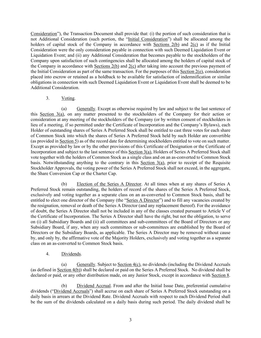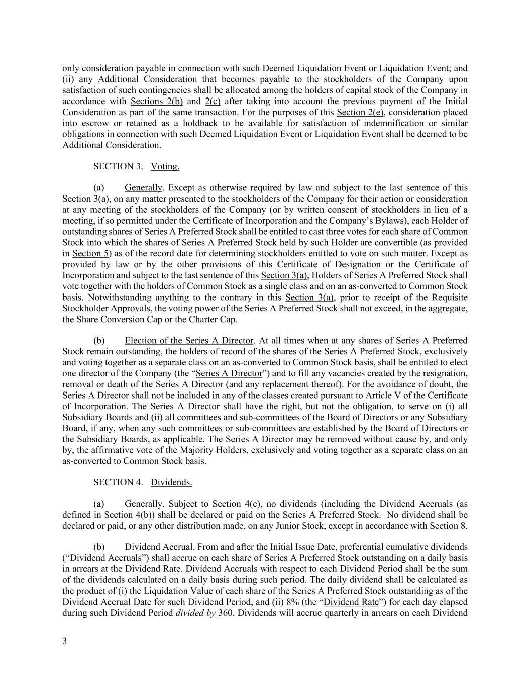 3 only consideration payable in connection with such Deemed Liquidation Event or Liquidation Event; and (ii) any Additional Consideration that becomes payable to the stockholders of the Company upon satisfaction of such contingencies shall be allocated among the holders of capital stock of the Company in accordance with Sections 2(b) and 2(c) after taking into account the previous payment of the Initial Consideration as part of the same transaction. For the purposes of this Section 2(e), consideration placed into escrow or retained as a holdback to be available for satisfaction of indemnification or similar obligations in connection with such Deemed Liquidation Event or Liquidation Event shall be deemed to be Additional Consideration. SECTION 3. Voting. (a) Generally. Except as otherwise required by law and subject to the last sentence of this Section 3(a), on any matter presented to the stockholders of the Company for their action or consideration at any meeting of the stockholders of the Company (or by written consent of stockholders in lieu of a meeting, if so permitted under the Certificate of Incorporation and the Company’s Bylaws), each Holder of outstanding shares of Series A Preferred Stock shall be entitled to cast three votes for each share of Common Stock into which the shares of Series A Preferred Stock held by such Holder are convertible (as provided in Section 5) as of the record date for determining stockholders entitled to vote on such matter. Except as provided by law or by the other provisions of this Certificate of Designation or the Certificate of Incorporation and subject to the last sentence of this Section 3(a), Holders of Series A Preferred Stock shall vote together with the holders of Common Stock as a single class and on an as-converted to Common Stock basis. Notwithstanding anything to the contrary in this Section 3(a), prior to receipt of the Requisite Stockholder Approvals, the voting power of the Series A Preferred Stock shall not exceed, in the aggregate, the Share Conversion Cap or the Charter Cap. (b) Election of the Series A Director. At all times when at any shares of Series A Preferred Stock remain outstanding, the holders of record of the shares of the Series A Preferred Stock, exclusively and voting together as a separate class on an as-converted to Common Stock basis, shall be entitled to elect one director of the Company (the “Series A Director”) and to fill any vacancies created by the resignation, removal or death of the Series A Director (and any replacement thereof). For the avoidance of doubt, the Series A Director shall not be included in any of the classes created pursuant to Article V of the Certificate of Incorporation. The Series A Director shall have the right, but not the obligation, to serve on (i) all Subsidiary Boards and (ii) all committees and sub-committees of the Board of Directors or any Subsidiary Board, if any, when any such committees or sub-committees are established by the Board of Directors or the Subsidiary Boards, as applicable. The Series A Director may be removed without cause by, and only by, the affirmative vote of the Majority Holders, exclusively and voting together as a separate class on an as-converted to Common Stock basis. SECTION 4. Dividends. (a) Generally. Subject to Section 4(c), no dividends (including the Dividend Accruals (as defined in Section 4(b)) shall be declared or paid on the Series A Preferred Stock. No dividend shall be declared or paid, or any other distribution made, on any Junior Stock, except in accordance with Section 8. (b) Dividend Accrual. From and after the Initial Issue Date, preferential cumulative dividends (“Dividend Accruals”) shall accrue on each share of Series A Preferred Stock outstanding on a daily basis in arrears at the Dividend Rate. Dividend Accruals with respect to each Dividend Period shall be the sum of the dividends calculated on a daily basis during such period. The daily dividend shall be calculated as the product of (i) the Liquidation Value of each share of the Series A Preferred Stock outstanding as of the Dividend Accrual Date for such Dividend Period, and (ii) 8% (the “Dividend Rate”) for each day elapsed during such Dividend Period divided by 360. Dividends will accrue quarterly in arrears on each Dividend