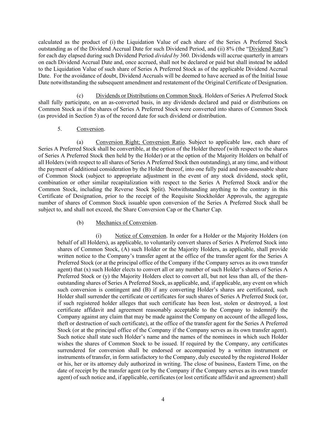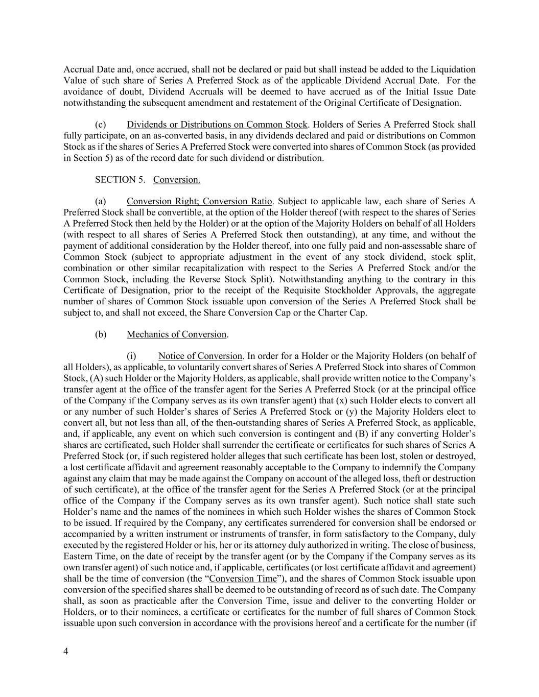 4 Accrual Date and, once accrued, shall not be declared or paid but shall instead be added to the Liquidation Value of such share of Series A Preferred Stock as of the applicable Dividend Accrual Date. For the avoidance of doubt, Dividend Accruals will be deemed to have accrued as of the Initial Issue Date notwithstanding the subsequent amendment and restatement of the Original Certificate of Designation. (c) Dividends or Distributions on Common Stock. Holders of Series A Preferred Stock shall fully participate, on an as-converted basis, in any dividends declared and paid or distributions on Common Stock as if the shares of Series A Preferred Stock were converted into shares of Common Stock (as provided in Section 5) as of the record date for such dividend or distribution. SECTION 5. Conversion. (a) Conversion Right; Conversion Ratio. Subject to applicable law, each share of Series A Preferred Stock shall be convertible, at the option of the Holder thereof (with respect to the shares of Series A Preferred Stock then held by the Holder) or at the option of the Majority Holders on behalf of all Holders (with respect to all shares of Series A Preferred Stock then outstanding), at any time, and without the payment of additional consideration by the Holder thereof, into one fully paid and non-assessable share of Common Stock (subject to appropriate adjustment in the event of any stock dividend, stock split, combination or other similar recapitalization with respect to the Series A Preferred Stock and/or the Common Stock, including the Reverse Stock Split). Notwithstanding anything to the contrary in this Certificate of Designation, prior to the receipt of the Requisite Stockholder Approvals, the aggregate number of shares of Common Stock issuable upon conversion of the Series A Preferred Stock shall be subject to, and shall not exceed, the Share Conversion Cap or the Charter Cap. (b) Mechanics of Conversion. (i) Notice of Conversion. In order for a Holder or the Majority Holders (on behalf of all Holders), as applicable, to voluntarily convert shares of Series A Preferred Stock into shares of Common Stock, (A) such Holder or the Majority Holders, as applicable, shall provide written notice to the Company’s transfer agent at the office of the transfer agent for the Series A Preferred Stock (or at the principal office of the Company if the Company serves as its own transfer agent) that (x) such Holder elects to convert all or any number of such Holder’s shares of Series A Preferred Stock or (y) the Majority Holders elect to convert all, but not less than all, of the then-outstanding shares of Series A Preferred Stock, as applicable, and, if applicable, any event on which such conversion is contingent and (B) if any converting Holder’s shares are certificated, such Holder shall surrender the certificate or certificates for such shares of Series A Preferred Stock (or, if such registered holder alleges that such certificate has been lost, stolen or destroyed, a lost certificate affidavit and agreement reasonably acceptable to the Company to indemnify the Company against any claim that may be made against the Company on account of the alleged loss, theft or destruction of such certificate), at the office of the transfer agent for the Series A Preferred Stock (or at the principal office of the Company if the Company serves as its own transfer agent). Such notice shall state such Holder’s name and the names of the nominees in which such Holder wishes the shares of Common Stock to be issued. If required by the Company, any certificates surrendered for conversion shall be endorsed or accompanied by a written instrument or instruments of transfer, in form satisfactory to the Company, duly executed by the registered Holder or his, her or its attorney duly authorized in writing. The close of business, Eastern Time, on the date of receipt by the transfer agent (or by the Company if the Company serves as its own transfer agent) of such notice and, if applicable, certificates (or lost certificate affidavit and agreement) shall be the time of conversion (the “Conversion Time”), and the shares of Common Stock issuable upon conversion of the specified shares shall be deemed to be outstanding of record as of such date. The Company shall, as soon as practicable after the Conversion Time, issue and deliver to the converting Holder or Holders, or to their nominees, a certificate or certificates for the number of full shares of Common Stock issuable upon such conversion in accordance with the provisions hereof and a certificate for the number (if