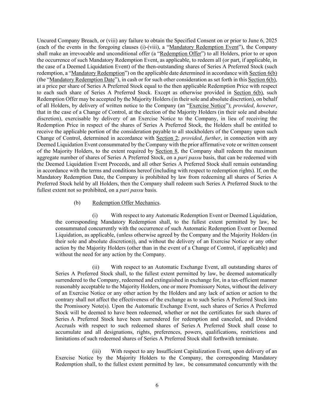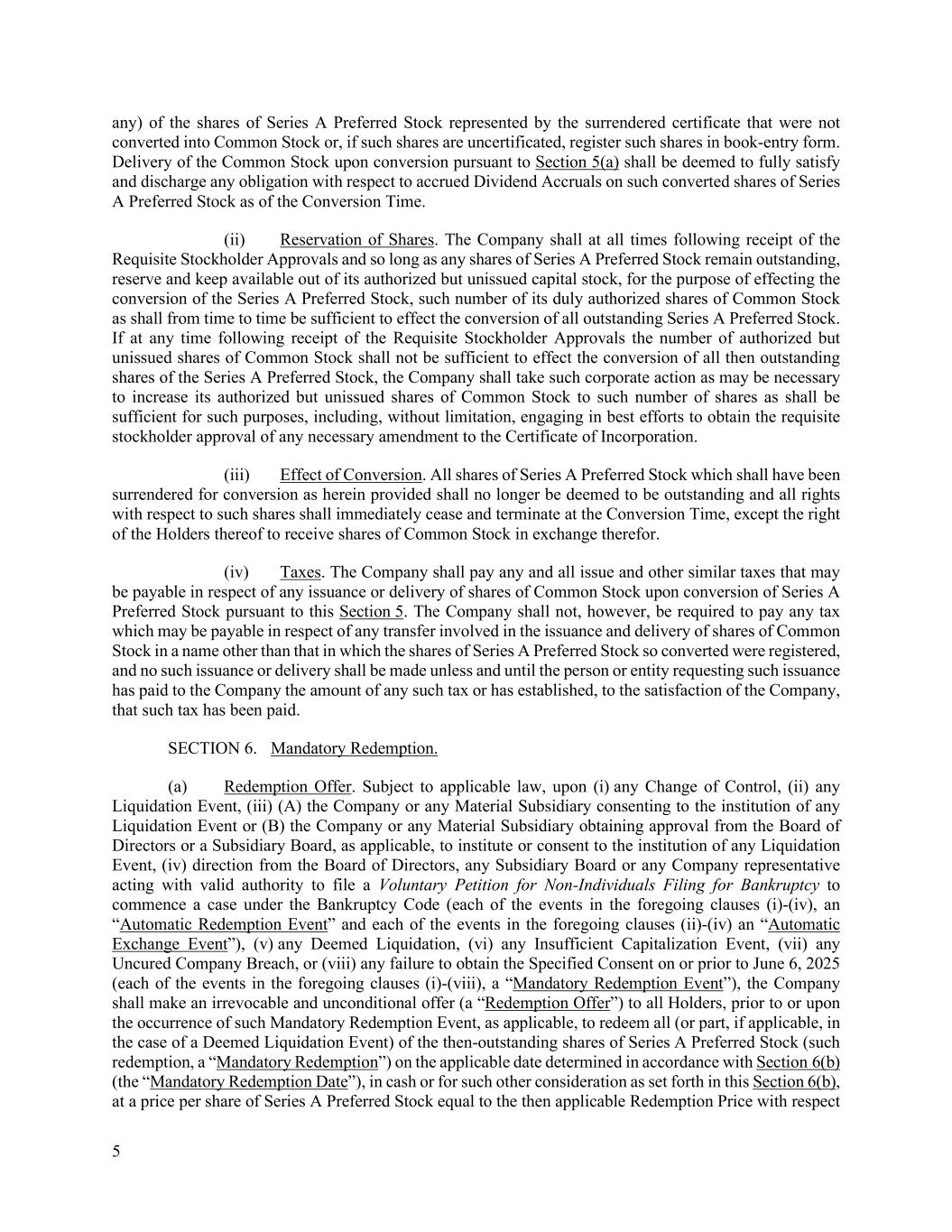 5 any) of the shares of Series A Preferred Stock represented by the surrendered certificate that were not converted into Common Stock or, if such shares are uncertificated, register such shares in book-entry form. Delivery of the Common Stock upon conversion pursuant to Section 5(a) shall be deemed to fully satisfy and discharge any obligation with respect to accrued Dividend Accruals on such converted shares of Series A Preferred Stock as of the Conversion Time. (ii) Reservation of Shares. The Company shall at all times following receipt of the Requisite Stockholder Approvals and so long as any shares of Series A Preferred Stock remain outstanding, reserve and keep available out of its authorized but unissued capital stock, for the purpose of effecting the conversion of the Series A Preferred Stock, such number of its duly authorized shares of Common Stock as shall from time to time be sufficient to effect the conversion of all outstanding Series A Preferred Stock. If at any time following receipt of the Requisite Stockholder Approvals the number of authorized but unissued shares of Common Stock shall not be sufficient to effect the conversion of all then outstanding shares of the Series A Preferred Stock, the Company shall take such corporate action as may be necessary to increase its authorized but unissued shares of Common Stock to such number of shares as shall be sufficient for such purposes, including, without limitation, engaging in best efforts to obtain the requisite stockholder approval of any necessary amendment to the Certificate of Incorporation. (iii) Effect of Conversion. All shares of Series A Preferred Stock which shall have been surrendered for conversion as herein provided shall no longer be deemed to be outstanding and all rights with respect to such shares shall immediately cease and terminate at the Conversion Time, except the right of the Holders thereof to receive shares of Common Stock in exchange therefor. (iv) Taxes. The Company shall pay any and all issue and other similar taxes that may be payable in respect of any issuance or delivery of shares of Common Stock upon conversion of Series A Preferred Stock pursuant to this Section 5. The Company shall not, however, be required to pay any tax which may be payable in respect of any transfer involved in the issuance and delivery of shares of Common Stock in a name other than that in which the shares of Series A Preferred Stock so converted were registered, and no such issuance or delivery shall be made unless and until the person or entity requesting such issuance has paid to the Company the amount of any such tax or has established, to the satisfaction of the Company, that such tax has been paid. SECTION 6. Mandatory Redemption. (a) Redemption Offer. Subject to applicable law, upon (i) any Change of Control, (ii) any Liquidation Event, (iii) (A) the Company or any Material Subsidiary consenting to the institution of any Liquidation Event or (B) the Company or any Material Subsidiary obtaining approval from the Board of Directors or a Subsidiary Board, as applicable, to institute or consent to the institution of any Liquidation Event, (iv) direction from the Board of Directors, any Subsidiary Board or any Company representative acting with valid authority to file a Voluntary Petition for Non-Individuals Filing for Bankruptcy to commence a case under the Bankruptcy Code (each of the events in the foregoing clauses (i)-(iv), an “Automatic Redemption Event” and each of the events in the foregoing clauses (ii)-(iv) an “Automatic Exchange Event”), (v) any Deemed Liquidation, (vi) any Insufficient Capitalization Event, (vii) any Uncured Company Breach, or (viii) any failure to obtain the Specified Consent on or prior to June 6, 2025 (each of the events in the foregoing clauses (i)-(viii), a “Mandatory Redemption Event”), the Company shall make an irrevocable and unconditional offer (a “Redemption Offer”) to all Holders, prior to or upon the occurrence of such Mandatory Redemption Event, as applicable, to redeem all (or part, if applicable, in the case of a Deemed Liquidation Event) of the then-outstanding shares of Series A Preferred Stock (such redemption, a “Mandatory Redemption”) on the applicable date determined in accordance with Section 6(b) (the “Mandatory Redemption Date”), in cash or for such other consideration as set forth in this Section 6(b), at a price per share of Series A Preferred Stock equal to the then applicable Redemption Price with respect