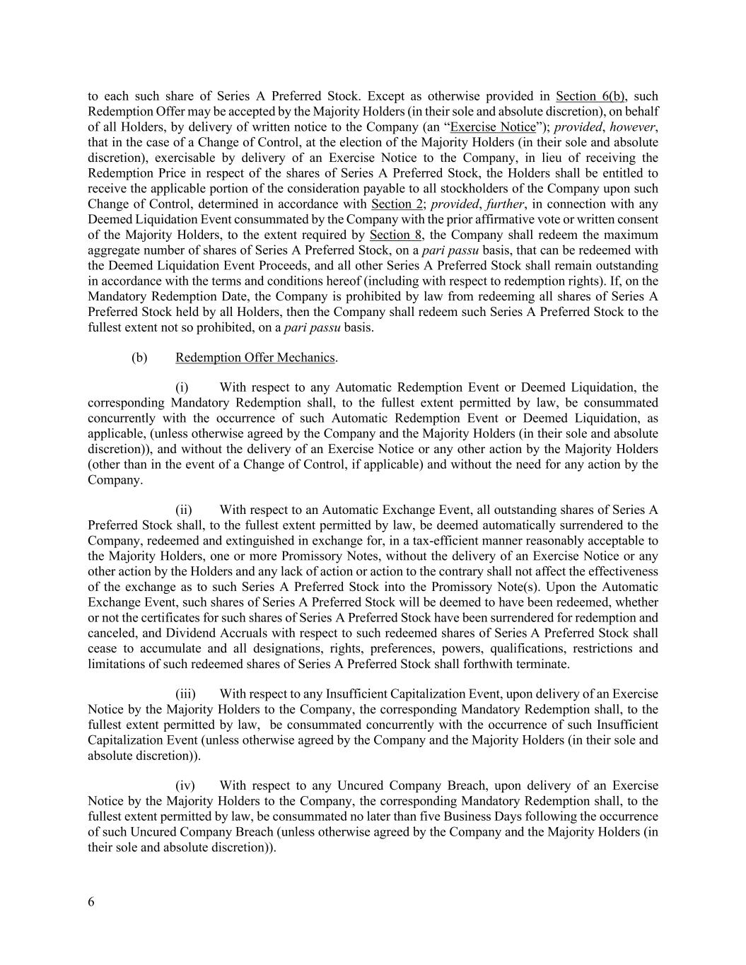 6 to each such share of Series A Preferred Stock. Except as otherwise provided in Section 6(b), such Redemption Offer may be accepted by the Majority Holders (in their sole and absolute discretion), on behalf of all Holders, by delivery of written notice to the Company (an “Exercise Notice”); provided, however, that in the case of a Change of Control, at the election of the Majority Holders (in their sole and absolute discretion), exercisable by delivery of an Exercise Notice to the Company, in lieu of receiving the Redemption Price in respect of the shares of Series A Preferred Stock, the Holders shall be entitled to receive the applicable portion of the consideration payable to all stockholders of the Company upon such Change of Control, determined in accordance with Section 2; provided, further, in connection with any Deemed Liquidation Event consummated by the Company with the prior affirmative vote or written consent of the Majority Holders, to the extent required by Section 8, the Company shall redeem the maximum aggregate number of shares of Series A Preferred Stock, on a pari passu basis, that can be redeemed with the Deemed Liquidation Event Proceeds, and all other Series A Preferred Stock shall remain outstanding in accordance with the terms and conditions hereof (including with respect to redemption rights). If, on the Mandatory Redemption Date, the Company is prohibited by law from redeeming all shares of Series A Preferred Stock held by all Holders, then the Company shall redeem such Series A Preferred Stock to the fullest extent not so prohibited, on a pari passu basis. (b) Redemption Offer Mechanics. (i) With respect to any Automatic Redemption Event or Deemed Liquidation, the corresponding Mandatory Redemption shall, to the fullest extent permitted by law, be consummated concurrently with the occurrence of such Automatic Redemption Event or Deemed Liquidation, as applicable, (unless otherwise agreed by the Company and the Majority Holders (in their sole and absolute discretion)), and without the delivery of an Exercise Notice or any other action by the Majority Holders (other than in the event of a Change of Control, if applicable) and without the need for any action by the Company. (ii) With respect to an Automatic Exchange Event, all outstanding shares of Series A Preferred Stock shall, to the fullest extent permitted by law, be deemed automatically surrendered to the Company, redeemed and extinguished in exchange for, in a tax-efficient manner reasonably acceptable to the Majority Holders, one or more Promissory Notes, without the delivery of an Exercise Notice or any other action by the Holders and any lack of action or action to the contrary shall not affect the effectiveness of the exchange as to such Series A Preferred Stock into the Promissory Note(s). Upon the Automatic Exchange Event, such shares of Series A Preferred Stock will be deemed to have been redeemed, whether or not the certificates for such shares of Series A Preferred Stock have been surrendered for redemption and canceled, and Dividend Accruals with respect to such redeemed shares of Series A Preferred Stock shall cease to accumulate and all designations, rights, preferences, powers, qualifications, restrictions and limitations of such redeemed shares of Series A Preferred Stock shall forthwith terminate. (iii) With respect to any Insufficient Capitalization Event, upon delivery of an Exercise Notice by the Majority Holders to the Company, the corresponding Mandatory Redemption shall, to the fullest extent permitted by law, be consummated concurrently with the occurrence of such Insufficient Capitalization Event (unless otherwise agreed by the Company and the Majority Holders (in their sole and absolute discretion)). (iv) With respect to any Uncured Company Breach, upon delivery of an Exercise Notice by the Majority Holders to the Company, the corresponding Mandatory Redemption shall, to the fullest extent permitted by law, be consummated no later than five Business Days following the occurrence of such Uncured Company Breach (unless otherwise agreed by the Company and the Majority Holders (in their sole and absolute discretion)).