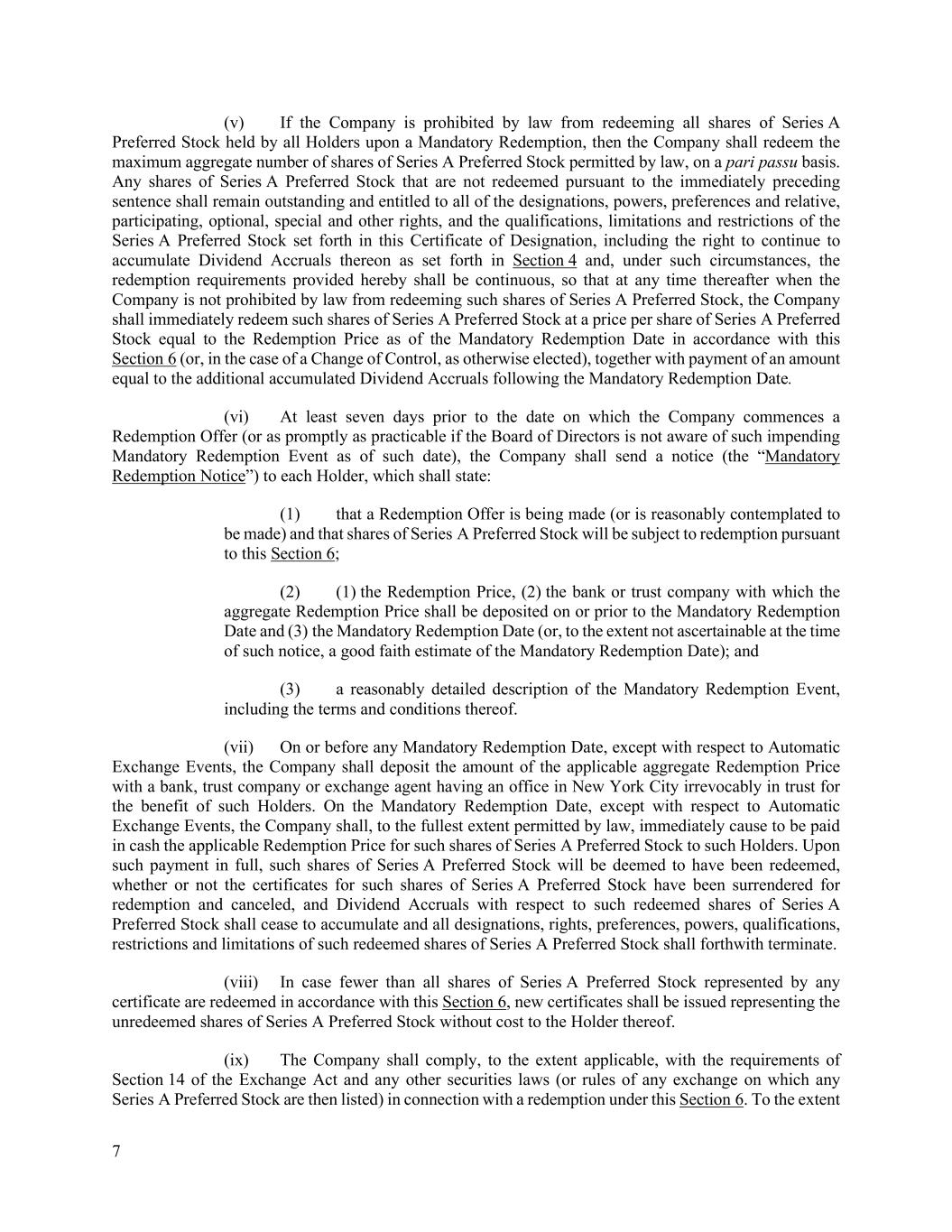 7 (v) If the Company is prohibited by law from redeeming all shares of Series A Preferred Stock held by all Holders upon a Mandatory Redemption, then the Company shall redeem the maximum aggregate number of shares of Series A Preferred Stock permitted by law, on a pari passu basis. Any shares of Series A Preferred Stock that are not redeemed pursuant to the immediately preceding sentence shall remain outstanding and entitled to all of the designations, powers, preferences and relative, participating, optional, special and other rights, and the qualifications, limitations and restrictions of the Series A Preferred Stock set forth in this Certificate of Designation, including the right to continue to accumulate Dividend Accruals thereon as set forth in Section 4 and, under such circumstances, the redemption requirements provided hereby shall be continuous, so that at any time thereafter when the Company is not prohibited by law from redeeming such shares of Series A Preferred Stock, the Company shall immediately redeem such shares of Series A Preferred Stock at a price per share of Series A Preferred Stock equal to the Redemption Price as of the Mandatory Redemption Date in accordance with this Section 6 (or, in the case of a Change of Control, as otherwise elected), together with payment of an amount equal to the additional accumulated Dividend Accruals following the Mandatory Redemption Date. (vi) At least seven days prior to the date on which the Company commences a Redemption Offer (or as promptly as practicable if the Board of Directors is not aware of such impending Mandatory Redemption Event as of such date), the Company shall send a notice (the “Mandatory Redemption Notice”) to each Holder, which shall state: (1) that a Redemption Offer is being made (or is reasonably contemplated to be made) and that shares of Series A Preferred Stock will be subject to redemption pursuant to this Section 6; (2) (1) the Redemption Price, (2) the bank or trust company with which the aggregate Redemption Price shall be deposited on or prior to the Mandatory Redemption Date and (3) the Mandatory Redemption Date (or, to the extent not ascertainable at the time of such notice, a good faith estimate of the Mandatory Redemption Date); and (3) a reasonably detailed description of the Mandatory Redemption Event, including the terms and conditions thereof. (vii) On or before any Mandatory Redemption Date, except with respect to Automatic Exchange Events, the Company shall deposit the amount of the applicable aggregate Redemption Price with a bank, trust company or exchange agent having an office in New York City irrevocably in trust for the benefit of such Holders. On the Mandatory Redemption Date, except with respect to Automatic Exchange Events, the Company shall, to the fullest extent permitted by law, immediately cause to be paid in cash the applicable Redemption Price for such shares of Series A Preferred Stock to such Holders. Upon such payment in full, such shares of Series A Preferred Stock will be deemed to have been redeemed, whether or not the certificates for such shares of Series A Preferred Stock have been surrendered for redemption and canceled, and Dividend Accruals with respect to such redeemed shares of Series A Preferred Stock shall cease to accumulate and all designations, rights, preferences, powers, qualifications, restrictions and limitations of such redeemed shares of Series A Preferred Stock shall forthwith terminate. (viii) In case fewer than all shares of Series A Preferred Stock represented by any certificate are redeemed in accordance with this Section 6, new certificates shall be issued representing the unredeemed shares of Series A Preferred Stock without cost to the Holder thereof. (ix) The Company shall comply, to the extent applicable, with the requirements of Section 14 of the Exchange Act and any other securities laws (or rules of any exchange on which any Series A Preferred Stock are then listed) in connection with a redemption under this Section 6. To the extent