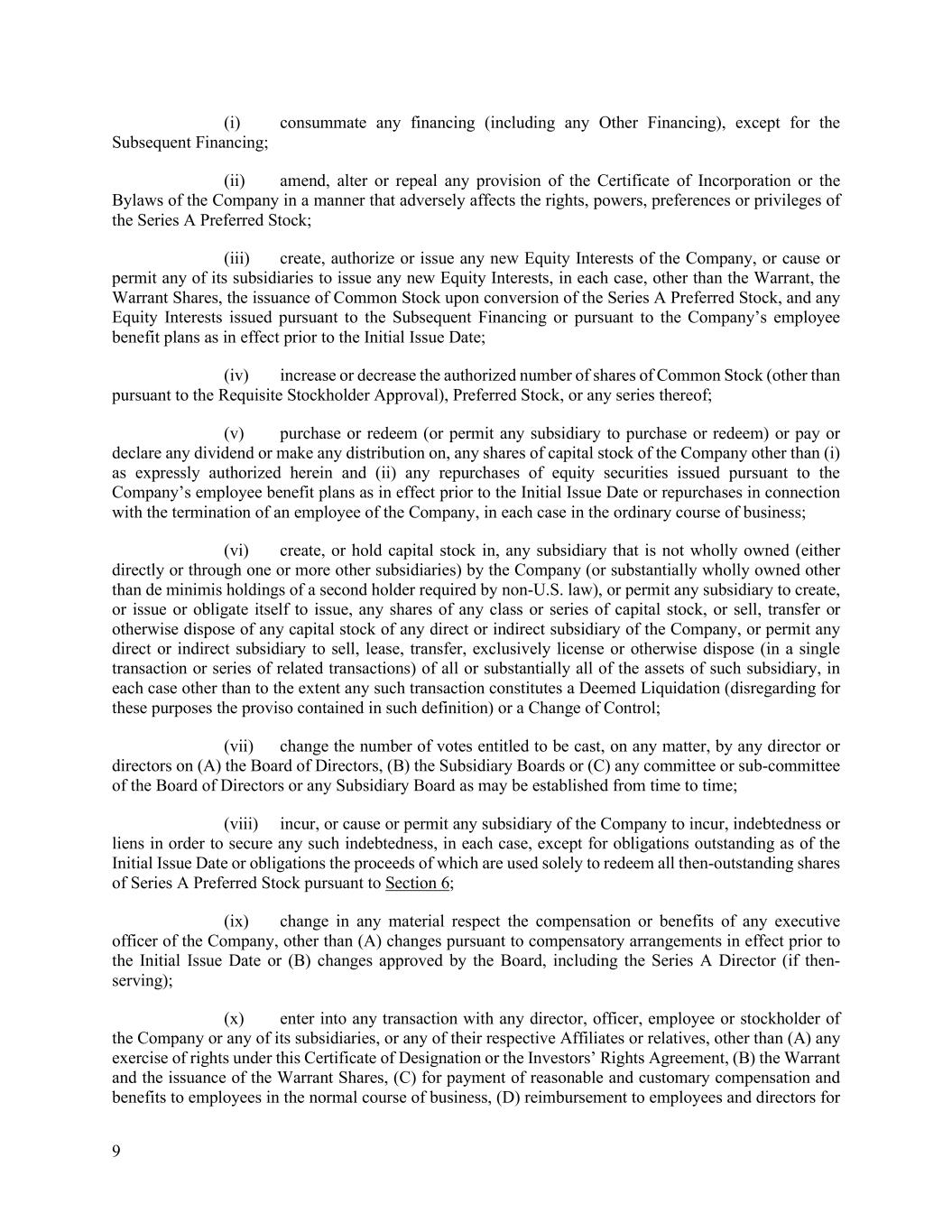 9 (i) consummate any financing (including any Other Financing), except for the Subsequent Financing; (ii) amend, alter or repeal any provision of the Certificate of Incorporation or the Bylaws of the Company in a manner that adversely affects the rights, powers, preferences or privileges of the Series A Preferred Stock; (iii) create, authorize or issue any new Equity Interests of the Company, or cause or permit any of its subsidiaries to issue any new Equity Interests, in each case, other than the Warrant, the Warrant Shares, the issuance of Common Stock upon conversion of the Series A Preferred Stock, and any Equity Interests issued pursuant to the Subsequent Financing or pursuant to the Company’s employee benefit plans as in effect prior to the Initial Issue Date; (iv) increase or decrease the authorized number of shares of Common Stock (other than pursuant to the Requisite Stockholder Approval), Preferred Stock, or any series thereof; (v) purchase or redeem (or permit any subsidiary to purchase or redeem) or pay or declare any dividend or make any distribution on, any shares of capital stock of the Company other than (i) as expressly authorized herein and (ii) any repurchases of equity securities issued pursuant to the Company’s employee benefit plans as in effect prior to the Initial Issue Date or repurchases in connection with the termination of an employee of the Company, in each case in the ordinary course of business; (vi) create, or hold capital stock in, any subsidiary that is not wholly owned (either directly or through one or more other subsidiaries) by the Company (or substantially wholly owned other than de minimis holdings of a second holder required by non-U.S. law), or permit any subsidiary to create, or issue or obligate itself to issue, any shares of any class or series of capital stock, or sell, transfer or otherwise dispose of any capital stock of any direct or indirect subsidiary of the Company, or permit any direct or indirect subsidiary to sell, lease, transfer, exclusively license or otherwise dispose (in a single transaction or series of related transactions) of all or substantially all of the assets of such subsidiary, in each case other than to the extent any such transaction constitutes a Deemed Liquidation (disregarding for these purposes the proviso contained in such definition) or a Change of Control; (vii) change the number of votes entitled to be cast, on any matter, by any director or directors on (A) the Board of Directors, (B) the Subsidiary Boards or (C) any committee or sub-committee of the Board of Directors or any Subsidiary Board as may be established from time to time; (viii) incur, or cause or permit any subsidiary of the Company to incur, indebtedness or liens in order to secure any such indebtedness, in each case, except for obligations outstanding as of the Initial Issue Date or obligations the proceeds of which are used solely to redeem all then-outstanding shares of Series A Preferred Stock pursuant to Section 6; (ix) change in any material respect the compensation or benefits of any executive officer of the Company, other than (A) changes pursuant to compensatory arrangements in effect prior to the Initial Issue Date or (B) changes approved by the Board, including the Series A Director (if then- serving); (x) enter into any transaction with any director, officer, employee or stockholder of the Company or any of its subsidiaries, or any of their respective Affiliates or relatives, other than (A) any exercise of rights under this Certificate of Designation or the Investors’ Rights Agreement, (B) the Warrant and the issuance of the Warrant Shares, (C) for payment of reasonable and customary compensation and benefits to employees in the normal course of business, (D) reimbursement to employees and directors for