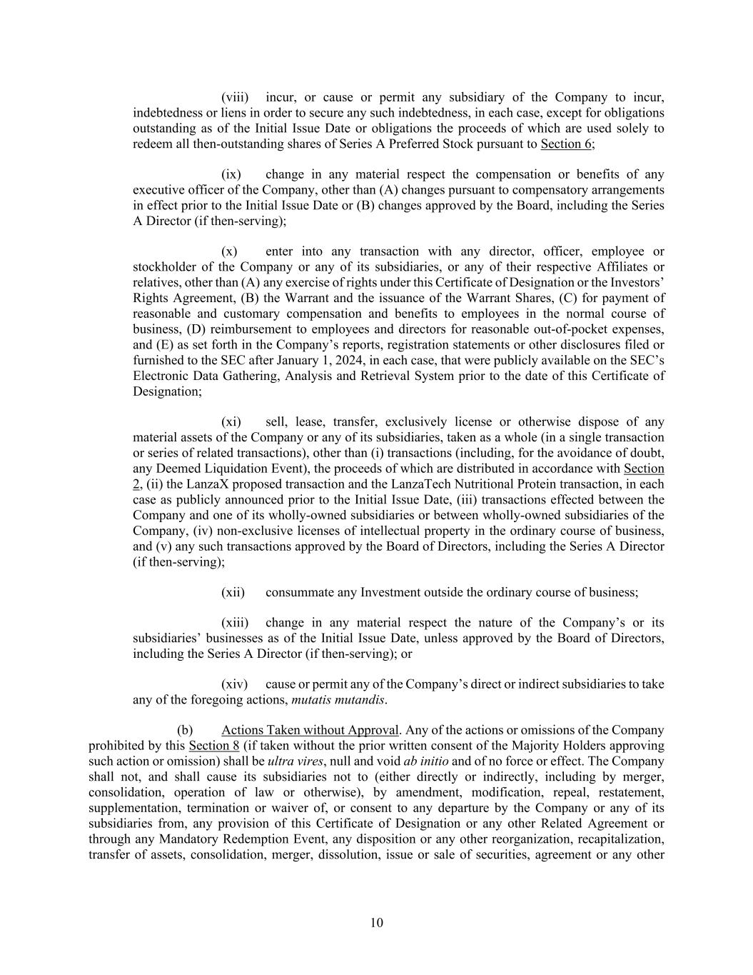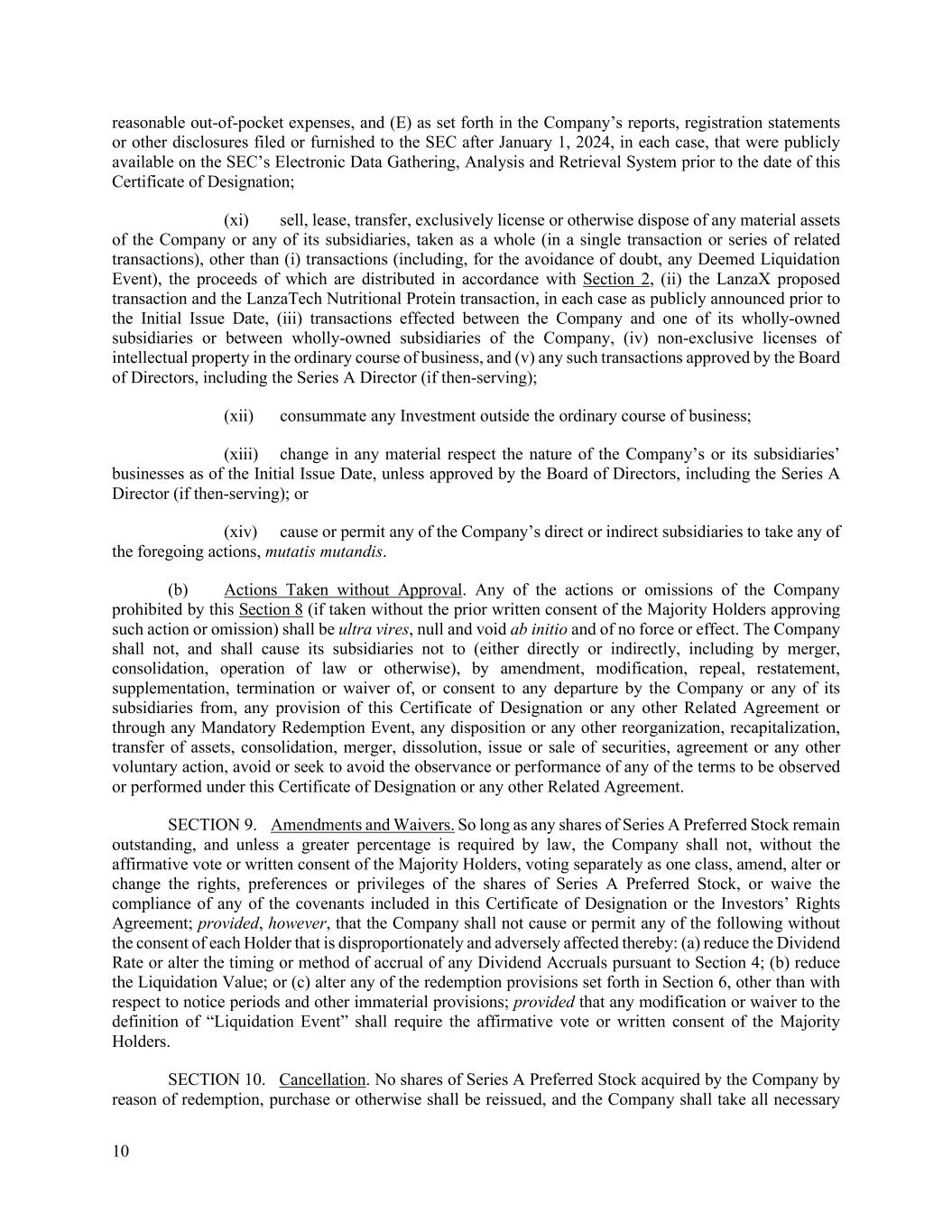 10 reasonable out-of-pocket expenses, and (E) as set forth in the Company’s reports, registration statements or other disclosures filed or furnished to the SEC after January 1, 2024, in each case, that were publicly available on the SEC’s Electronic Data Gathering, Analysis and Retrieval System prior to the date of this Certificate of Designation; (xi) sell, lease, transfer, exclusively license or otherwise dispose of any material assets of the Company or any of its subsidiaries, taken as a whole (in a single transaction or series of related transactions), other than (i) transactions (including, for the avoidance of doubt, any Deemed Liquidation Event), the proceeds of which are distributed in accordance with Section 2, (ii) the LanzaX proposed transaction and the LanzaTech Nutritional Protein transaction, in each case as publicly announced prior to the Initial Issue Date, (iii) transactions effected between the Company and one of its wholly-owned subsidiaries or between wholly-owned subsidiaries of the Company, (iv) non-exclusive licenses of intellectual property in the ordinary course of business, and (v) any such transactions approved by the Board of Directors, including the Series A Director (if then-serving); (xii) consummate any Investment outside the ordinary course of business; (xiii) change in any material respect the nature of the Company’s or its subsidiaries’ businesses as of the Initial Issue Date, unless approved by the Board of Directors, including the Series A Director (if then-serving); or (xiv) cause or permit any of the Company’s direct or indirect subsidiaries to take any of the foregoing actions, mutatis mutandis. (b) Actions Taken without Approval. Any of the actions or omissions of the Company prohibited by this Section 8 (if taken without the prior written consent of the Majority Holders approving such action or omission) shall be ultra vires, null and void ab initio and of no force or effect. The Company shall not, and shall cause its subsidiaries not to (either directly or indirectly, including by merger, consolidation, operation of law or otherwise), by amendment, modification, repeal, restatement, supplementation, termination or waiver of, or consent to any departure by the Company or any of its subsidiaries from, any provision of this Certificate of Designation or any other Related Agreement or through any Mandatory Redemption Event, any disposition or any other reorganization, recapitalization, transfer of assets, consolidation, merger, dissolution, issue or sale of securities, agreement or any other voluntary action, avoid or seek to avoid the observance or performance of any of the terms to be observed or performed under this Certificate of Designation or any other Related Agreement. SECTION 9. Amendments and Waivers. So long as any shares of Series A Preferred Stock remain outstanding, and unless a greater percentage is required by law, the Company shall not, without the affirmative vote or written consent of the Majority Holders, voting separately as one class, amend, alter or change the rights, preferences or privileges of the shares of Series A Preferred Stock, or waive the compliance of any of the covenants included in this Certificate of Designation or the Investors’ Rights Agreement; provided, however, that the Company shall not cause or permit any of the following without the consent of each Holder that is disproportionately and adversely affected thereby: (a) reduce the Dividend Rate or alter the timing or method of accrual of any Dividend Accruals pursuant to Section 4; (b) reduce the Liquidation Value; or (c) alter any of the redemption provisions set forth in Section 6, other than with respect to notice periods and other immaterial provisions; provided that any modification or waiver to the definition of “Liquidation Event” shall require the affirmative vote or written consent of the Majority Holders. SECTION 10. Cancellation. No shares of Series A Preferred Stock acquired by the Company by reason of redemption, purchase or otherwise shall be reissued, and the Company shall take all necessary