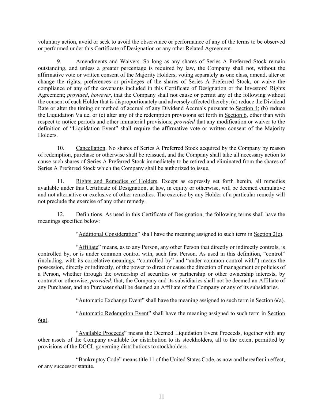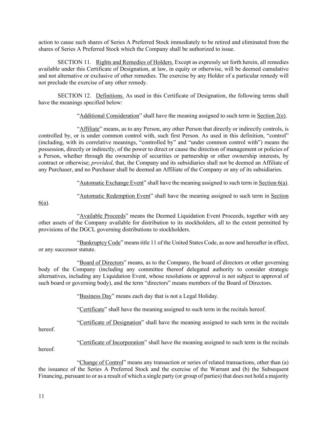11 action to cause such shares of Series A Preferred Stock immediately to be retired and eliminated from the shares of Series A Preferred Stock which the Company shall be authorized to issue. SECTION 11. Rights and Remedies of Holders. Except as expressly set forth herein, all remedies available under this Certificate of Designation, at law, in equity or otherwise, will be deemed cumulative and not alternative or exclusive of other remedies. The exercise by any Holder of a particular remedy will not preclude the exercise of any other remedy. SECTION 12. Definitions. As used in this Certificate of Designation, the following terms shall have the meanings specified below: “Additional Consideration” shall have the meaning assigned to such term in Section 2(e). “Affiliate” means, as to any Person, any other Person that directly or indirectly controls, is controlled by, or is under common control with, such first Person. As used in this definition, “control” (including, with its correlative meanings, “controlled by” and “under common control with”) means the possession, directly or indirectly, of the power to direct or cause the direction of management or policies of a Person, whether through the ownership of securities or partnership or other ownership interests, by contract or otherwise; provided, that, the Company and its subsidiaries shall not be deemed an Affiliate of any Purchaser, and no Purchaser shall be deemed an Affiliate of the Company or any of its subsidiaries. “Automatic Exchange Event” shall have the meaning assigned to such term in Section 6(a). “Automatic Redemption Event” shall have the meaning assigned to such term in Section 6(a). “Available Proceeds” means the Deemed Liquidation Event Proceeds, together with any other assets of the Company available for distribution to its stockholders, all to the extent permitted by provisions of the DGCL governing distributions to stockholders. “Bankruptcy Code” means title 11 of the United States Code, as now and hereafter in effect, or any successor statute. “Board of Directors” means, as to the Company, the board of directors or other governing body of the Company (including any committee thereof delegated authority to consider strategic alternatives, including any Liquidation Event, whose resolutions or approval is not subject to approval of such board or governing body), and the term “directors” means members of the Board of Directors. “Business Day” means each day that is not a Legal Holiday. “Certificate” shall have the meaning assigned to such term in the recitals hereof. “Certificate of Designation” shall have the meaning assigned to such term in the recitals hereof. “Certificate of Incorporation” shall have the meaning assigned to such term in the recitals hereof. “Change of Control” means any transaction or series of related transactions, other than (a) the issuance of the Series A Preferred Stock and the exercise of the Warrant and (b) the Subsequent Financing, pursuant to or as a result of which a single party (or group of parties) that does not hold a majority