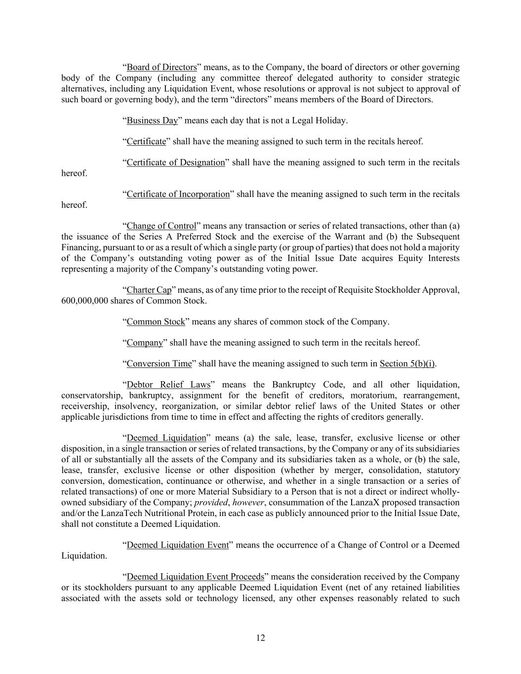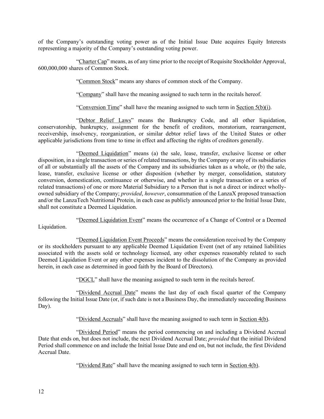 12 of the Company’s outstanding voting power as of the Initial Issue Date acquires Equity Interests representing a majority of the Company’s outstanding voting power. “Charter Cap” means, as of any time prior to the receipt of Requisite Stockholder Approval, 600,000,000 shares of Common Stock. “Common Stock” means any shares of common stock of the Company. “Company” shall have the meaning assigned to such term in the recitals hereof. “Conversion Time” shall have the meaning assigned to such term in Section 5(b)(i). “Debtor Relief Laws” means the Bankruptcy Code, and all other liquidation, conservatorship, bankruptcy, assignment for the benefit of creditors, moratorium, rearrangement, receivership, insolvency, reorganization, or similar debtor relief laws of the United States or other applicable jurisdictions from time to time in effect and affecting the rights of creditors generally. “Deemed Liquidation” means (a) the sale, lease, transfer, exclusive license or other disposition, in a single transaction or series of related transactions, by the Company or any of its subsidiaries of all or substantially all the assets of the Company and its subsidiaries taken as a whole, or (b) the sale, lease, transfer, exclusive license or other disposition (whether by merger, consolidation, statutory conversion, domestication, continuance or otherwise, and whether in a single transaction or a series of related transactions) of one or more Material Subsidiary to a Person that is not a direct or indirect wholly- owned subsidiary of the Company; provided, however, consummation of the LanzaX proposed transaction and/or the LanzaTech Nutritional Protein, in each case as publicly announced prior to the Initial Issue Date, shall not constitute a Deemed Liquidation. “Deemed Liquidation Event” means the occurrence of a Change of Control or a Deemed Liquidation. “Deemed Liquidation Event Proceeds” means the consideration received by the Company or its stockholders pursuant to any applicable Deemed Liquidation Event (net of any retained liabilities associated with the assets sold or technology licensed, any other expenses reasonably related to such Deemed Liquidation Event or any other expenses incident to the dissolution of the Company as provided herein, in each case as determined in good faith by the Board of Directors). “DGCL” shall have the meaning assigned to such term in the recitals hereof. “Dividend Accrual Date” means the last day of each fiscal quarter of the Company following the Initial Issue Date (or, if such date is not a Business Day, the immediately succeeding Business Day). “Dividend Accruals” shall have the meaning assigned to such term in Section 4(b). “Dividend Period” means the period commencing on and including a Dividend Accrual Date that ends on, but does not include, the next Dividend Accrual Date; provided that the initial Dividend Period shall commence on and include the Initial Issue Date and end on, but not include, the first Dividend Accrual Date. “Dividend Rate” shall have the meaning assigned to such term in Section 4(b).