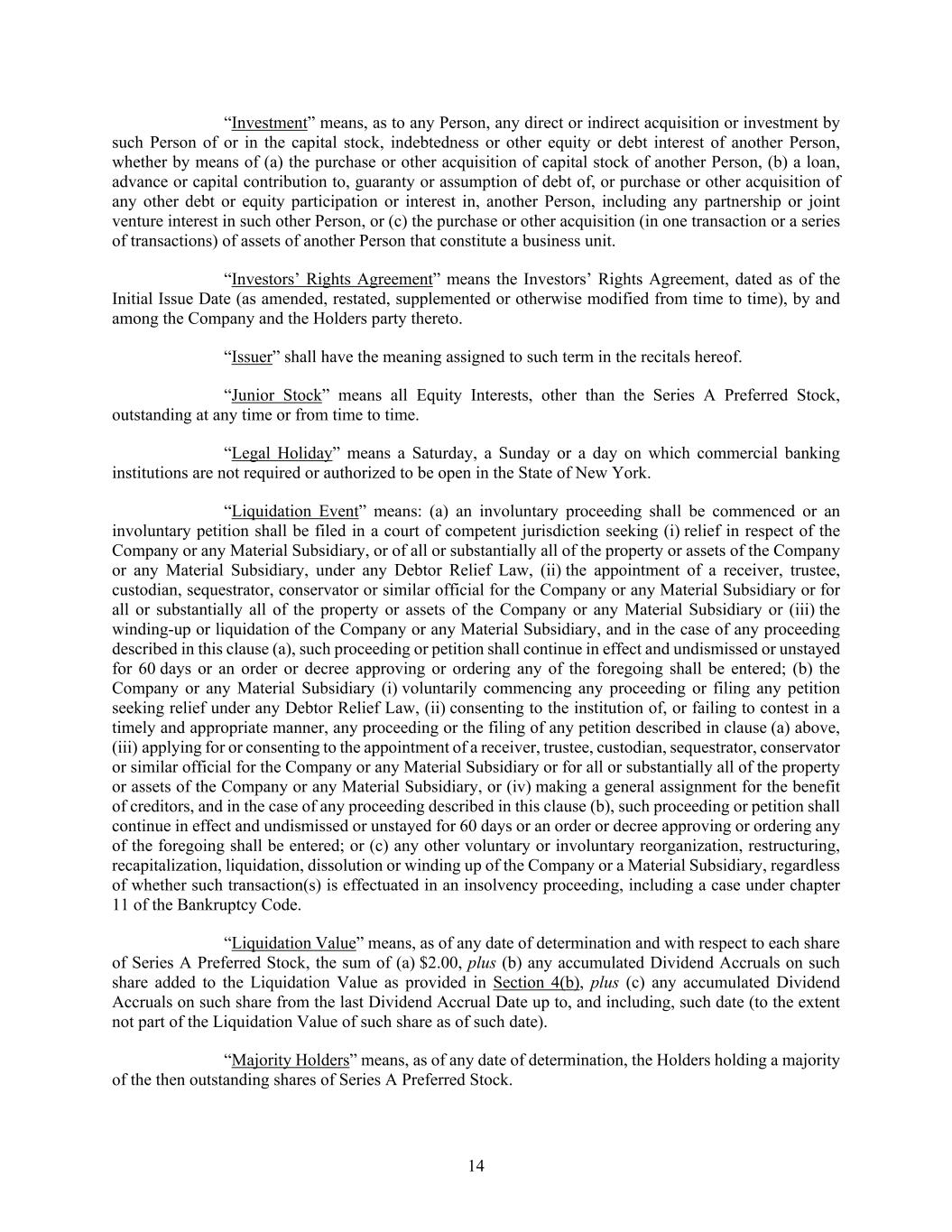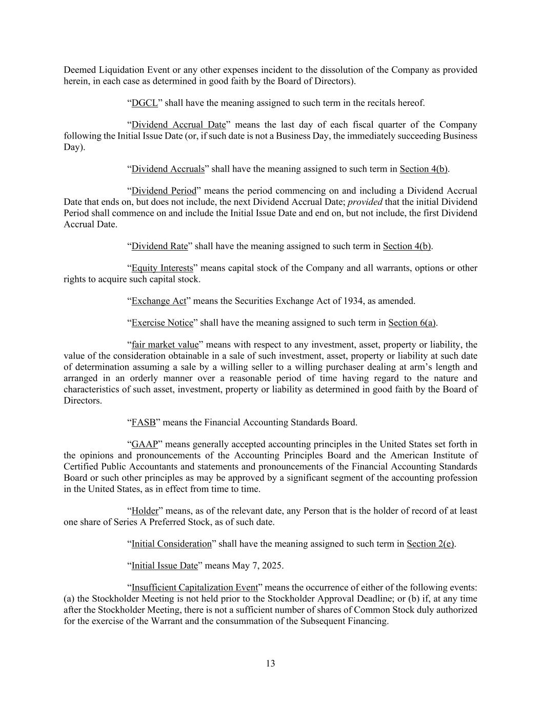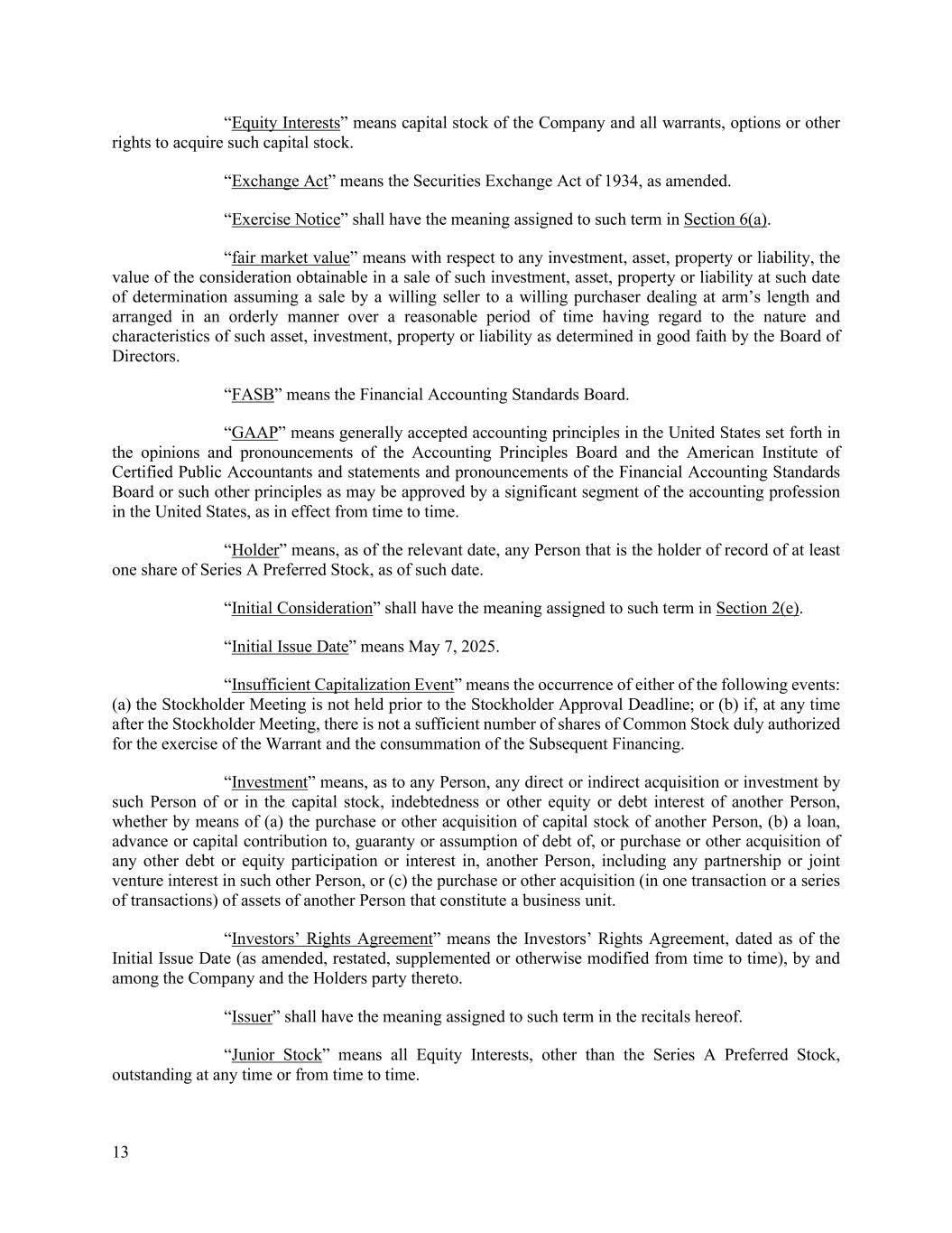 13 “Equity Interests” means capital stock of the Company and all warrants, options or other rights to acquire such capital stock. “Exchange Act” means the Securities Exchange Act of 1934, as amended. “Exercise Notice” shall have the meaning assigned to such term in Section 6(a). “fair market value” means with respect to any investment, asset, property or liability, the value of the consideration obtainable in a sale of such investment, asset, property or liability at such date of determination assuming a sale by a willing seller to a willing purchaser dealing at arm’s length and arranged in an orderly manner over a reasonable period of time having regard to the nature and characteristics of such asset, investment, property or liability as determined in good faith by the Board of Directors. “FASB” means the Financial Accounting Standards Board. “GAAP” means generally accepted accounting principles in the United States set forth in the opinions and pronouncements of the Accounting Principles Board and the American Institute of Certified Public Accountants and statements and pronouncements of the Financial Accounting Standards Board or such other principles as may be approved by a significant segment of the accounting profession in the United States, as in effect from time to time. “Holder” means, as of the relevant date, any Person that is the holder of record of at least one share of Series A Preferred Stock, as of such date. “Initial Consideration” shall have the meaning assigned to such term in Section 2(e). “Initial Issue Date” means May 7, 2025. “Insufficient Capitalization Event” means the occurrence of either of the following events: (a) the Stockholder Meeting is not held prior to the Stockholder Approval Deadline; or (b) if, at any time after the Stockholder Meeting, there is not a sufficient number of shares of Common Stock duly authorized for the exercise of the Warrant and the consummation of the Subsequent Financing. “Investment” means, as to any Person, any direct or indirect acquisition or investment by such Person of or in the capital stock, indebtedness or other equity or debt interest of another Person, whether by means of (a) the purchase or other acquisition of capital stock of another Person, (b) a loan, advance or capital contribution to, guaranty or assumption of debt of, or purchase or other acquisition of any other debt or equity participation or interest in, another Person, including any partnership or joint venture interest in such other Person, or (c) the purchase or other acquisition (in one transaction or a series of transactions) of assets of another Person that constitute a business unit. “Investors’ Rights Agreement” means the Investors’ Rights Agreement, dated as of the Initial Issue Date (as amended, restated, supplemented or otherwise modified from time to time), by and among the Company and the Holders party thereto. “Issuer” shall have the meaning assigned to such term in the recitals hereof. “Junior Stock” means all Equity Interests, other than the Series A Preferred Stock, outstanding at any time or from time to time.