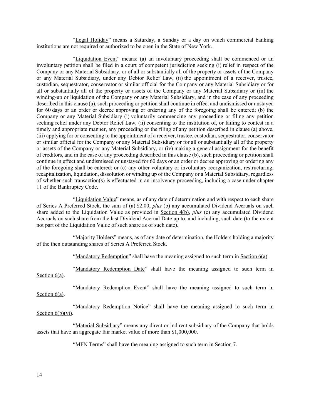 14 “Legal Holiday” means a Saturday, a Sunday or a day on which commercial banking institutions are not required or authorized to be open in the State of New York. “Liquidation Event” means: (a) an involuntary proceeding shall be commenced or an involuntary petition shall be filed in a court of competent jurisdiction seeking (i) relief in respect of the Company or any Material Subsidiary, or of all or substantially all of the property or assets of the Company or any Material Subsidiary, under any Debtor Relief Law, (ii) the appointment of a receiver, trustee, custodian, sequestrator, conservator or similar official for the Company or any Material Subsidiary or for all or substantially all of the property or assets of the Company or any Material Subsidiary or (iii) the winding-up or liquidation of the Company or any Material Subsidiary, and in the case of any proceeding described in this clause (a), such proceeding or petition shall continue in effect and undismissed or unstayed for 60 days or an order or decree approving or ordering any of the foregoing shall be entered; (b) the Company or any Material Subsidiary (i) voluntarily commencing any proceeding or filing any petition seeking relief under any Debtor Relief Law, (ii) consenting to the institution of, or failing to contest in a timely and appropriate manner, any proceeding or the filing of any petition described in clause (a) above, (iii) applying for or consenting to the appointment of a receiver, trustee, custodian, sequestrator, conservator or similar official for the Company or any Material Subsidiary or for all or substantially all of the property or assets of the Company or any Material Subsidiary, or (iv) making a general assignment for the benefit of creditors, and in the case of any proceeding described in this clause (b), such proceeding or petition shall continue in effect and undismissed or unstayed for 60 days or an order or decree approving or ordering any of the foregoing shall be entered; or (c) any other voluntary or involuntary reorganization, restructuring, recapitalization, liquidation, dissolution or winding up of the Company or a Material Subsidiary, regardless of whether such transaction(s) is effectuated in an insolvency proceeding, including a case under chapter 11 of the Bankruptcy Code. “Liquidation Value” means, as of any date of determination and with respect to each share of Series A Preferred Stock, the sum of (a) $2.00, plus (b) any accumulated Dividend Accruals on such share added to the Liquidation Value as provided in Section 4(b), plus (c) any accumulated Dividend Accruals on such share from the last Dividend Accrual Date up to, and including, such date (to the extent not part of the Liquidation Value of such share as of such date). “Majority Holders” means, as of any date of determination, the Holders holding a majority of the then outstanding shares of Series A Preferred Stock. “Mandatory Redemption” shall have the meaning assigned to such term in Section 6(a). “Mandatory Redemption Date” shall have the meaning assigned to such term in Section 6(a). “Mandatory Redemption Event” shall have the meaning assigned to such term in Section 6(a). “Mandatory Redemption Notice” shall have the meaning assigned to such term in Section 6(b)(vi). “Material Subsidiary” means any direct or indirect subsidiary of the Company that holds assets that have an aggregate fair market value of more than $1,000,000. “MFN Terms” shall have the meaning assigned to such term in Section 7.