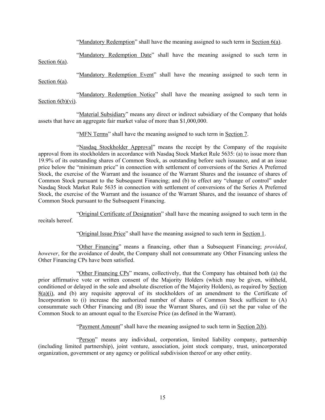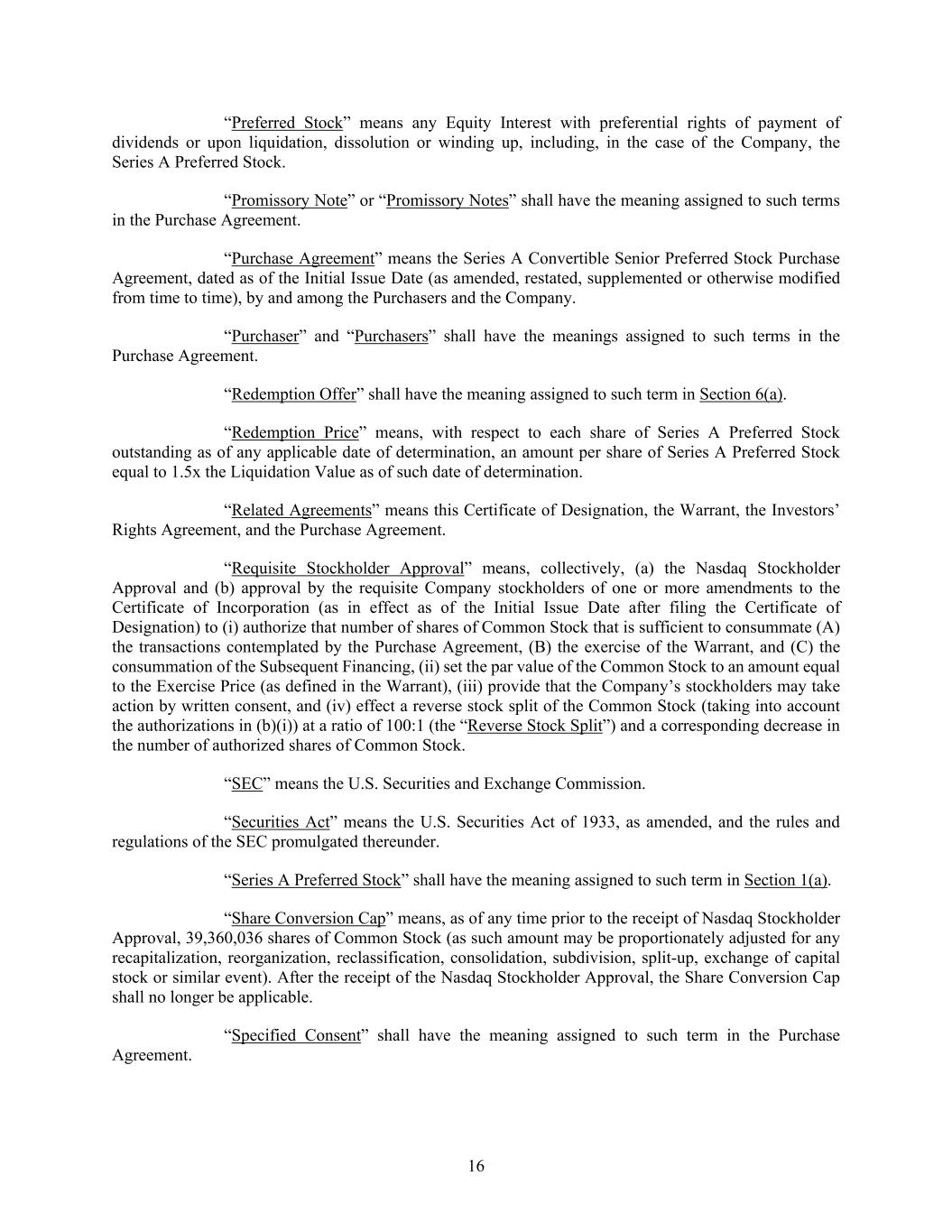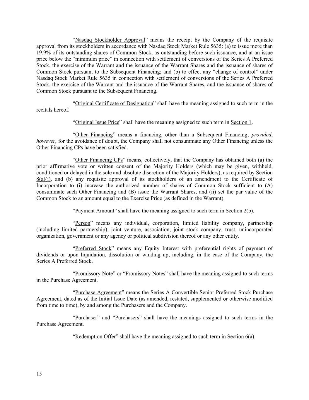 15 “Nasdaq Stockholder Approval” means the receipt by the Company of the requisite approval from its stockholders in accordance with Nasdaq Stock Market Rule 5635: (a) to issue more than 19.9% of its outstanding shares of Common Stock, as outstanding before such issuance, and at an issue price below the “minimum price” in connection with settlement of conversions of the Series A Preferred Stock, the exercise of the Warrant and the issuance of the Warrant Shares and the issuance of shares of Common Stock pursuant to the Subsequent Financing; and (b) to effect any “change of control” under Nasdaq Stock Market Rule 5635 in connection with settlement of conversions of the Series A Preferred Stock, the exercise of the Warrant and the issuance of the Warrant Shares, and the issuance of shares of Common Stock pursuant to the Subsequent Financing. “Original Certificate of Designation” shall have the meaning assigned to such term in the recitals hereof. “Original Issue Price” shall have the meaning assigned to such term in Section 1. “Other Financing” means a financing, other than a Subsequent Financing; provided, however, for the avoidance of doubt, the Company shall not consummate any Other Financing unless the Other Financing CPs have been satisfied. “Other Financing CPs” means, collectively, that the Company has obtained both (a) the prior affirmative vote or written consent of the Majority Holders (which may be given, withheld, conditioned or delayed in the sole and absolute discretion of the Majority Holders), as required by Section 8(a)(i), and (b) any requisite approval of its stockholders of an amendment to the Certificate of Incorporation to (i) increase the authorized number of shares of Common Stock sufficient to (A) consummate such Other Financing and (B) issue the Warrant Shares, and (ii) set the par value of the Common Stock to an amount equal to the Exercise Price (as defined in the Warrant). “Payment Amount” shall have the meaning assigned to such term in Section 2(b). “Person” means any individual, corporation, limited liability company, partnership (including limited partnership), joint venture, association, joint stock company, trust, unincorporated organization, government or any agency or political subdivision thereof or any other entity. “Preferred Stock” means any Equity Interest with preferential rights of payment of dividends or upon liquidation, dissolution or winding up, including, in the case of the Company, the Series A Preferred Stock. “Promissory Note” or “Promissory Notes” shall have the meaning assigned to such terms in the Purchase Agreement. “Purchase Agreement” means the Series A Convertible Senior Preferred Stock Purchase Agreement, dated as of the Initial Issue Date (as amended, restated, supplemented or otherwise modified from time to time), by and among the Purchasers and the Company. “Purchaser” and “Purchasers” shall have the meanings assigned to such terms in the Purchase Agreement. “Redemption Offer” shall have the meaning assigned to such term in Section 6(a).