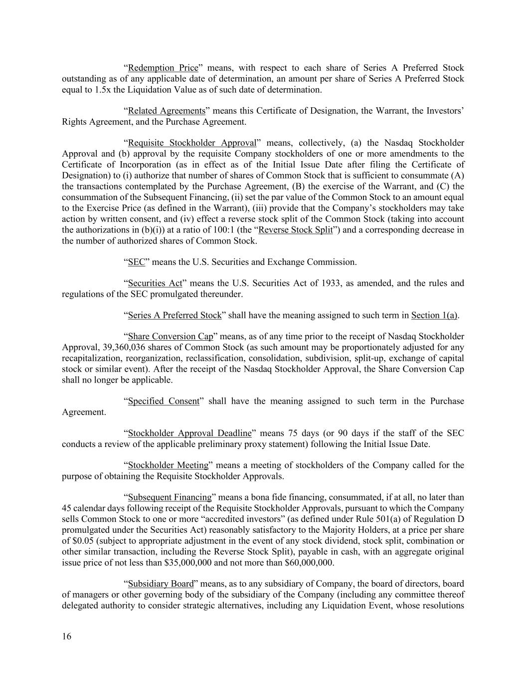 16 “Redemption Price” means, with respect to each share of Series A Preferred Stock outstanding as of any applicable date of determination, an amount per share of Series A Preferred Stock equal to 1.5x the Liquidation Value as of such date of determination. “Related Agreements” means this Certificate of Designation, the Warrant, the Investors’ Rights Agreement, and the Purchase Agreement. “Requisite Stockholder Approval” means, collectively, (a) the Nasdaq Stockholder Approval and (b) approval by the requisite Company stockholders of one or more amendments to the Certificate of Incorporation (as in effect as of the Initial Issue Date after filing the Certificate of Designation) to (i) authorize that number of shares of Common Stock that is sufficient to consummate (A) the transactions contemplated by the Purchase Agreement, (B) the exercise of the Warrant, and (C) the consummation of the Subsequent Financing, (ii) set the par value of the Common Stock to an amount equal to the Exercise Price (as defined in the Warrant), (iii) provide that the Company’s stockholders may take action by written consent, and (iv) effect a reverse stock split of the Common Stock (taking into account the authorizations in (b)(i)) at a ratio of 100:1 (the “Reverse Stock Split”) and a corresponding decrease in the number of authorized shares of Common Stock. “SEC” means the U.S. Securities and Exchange Commission. “Securities Act” means the U.S. Securities Act of 1933, as amended, and the rules and regulations of the SEC promulgated thereunder. “Series A Preferred Stock” shall have the meaning assigned to such term in Section 1(a). “Share Conversion Cap” means, as of any time prior to the receipt of Nasdaq Stockholder Approval, 39,360,036 shares of Common Stock (as such amount may be proportionately adjusted for any recapitalization, reorganization, reclassification, consolidation, subdivision, split-up, exchange of capital stock or similar event). After the receipt of the Nasdaq Stockholder Approval, the Share Conversion Cap shall no longer be applicable. “Specified Consent” shall have the meaning assigned to such term in the Purchase Agreement. “Stockholder Approval Deadline” means 75 days (or 90 days if the staff of the SEC conducts a review of the applicable preliminary proxy statement) following the Initial Issue Date. “Stockholder Meeting” means a meeting of stockholders of the Company called for the purpose of obtaining the Requisite Stockholder Approvals. “Subsequent Financing” means a bona fide financing, consummated, if at all, no later than 45 calendar days following receipt of the Requisite Stockholder Approvals, pursuant to which the Company sells Common Stock to one or more “accredited investors” (as defined under Rule 501(a) of Regulation D promulgated under the Securities Act) reasonably satisfactory to the Majority Holders, at a price per share of $0.05 (subject to appropriate adjustment in the event of any stock dividend, stock split, combination or other similar transaction, including the Reverse Stock Split), payable in cash, with an aggregate original issue price of not less than $35,000,000 and not more than $60,000,000. “Subsidiary Board” means, as to any subsidiary of Company, the board of directors, board of managers or other governing body of the subsidiary of the Company (including any committee thereof delegated authority to consider strategic alternatives, including any Liquidation Event, whose resolutions