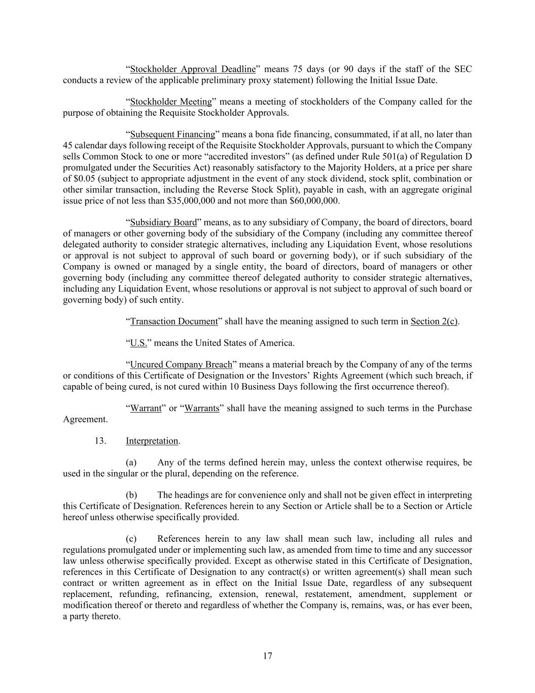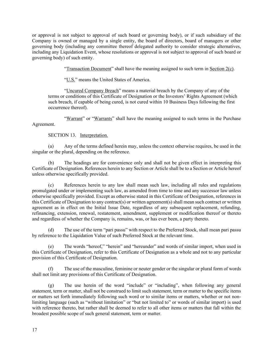 17 or approval is not subject to approval of such board or governing body), or if such subsidiary of the Company is owned or managed by a single entity, the board of directors, board of managers or other governing body (including any committee thereof delegated authority to consider strategic alternatives, including any Liquidation Event, whose resolutions or approval is not subject to approval of such board or governing body) of such entity. “Transaction Document” shall have the meaning assigned to such term in Section 2(c). “U.S.” means the United States of America. “Uncured Company Breach” means a material breach by the Company of any of the terms or conditions of this Certificate of Designation or the Investors’ Rights Agreement (which such breach, if capable of being cured, is not cured within 10 Business Days following the first occurrence thereof). “Warrant” or “Warrants” shall have the meaning assigned to such terms in the Purchase Agreement. SECTION 13. Interpretation. (a) Any of the terms defined herein may, unless the context otherwise requires, be used in the singular or the plural, depending on the reference. (b) The headings are for convenience only and shall not be given effect in interpreting this Certificate of Designation. References herein to any Section or Article shall be to a Section or Article hereof unless otherwise specifically provided. (c) References herein to any law shall mean such law, including all rules and regulations promulgated under or implementing such law, as amended from time to time and any successor law unless otherwise specifically provided. Except as otherwise stated in this Certificate of Designation, references in this Certificate of Designation to any contract(s) or written agreement(s) shall mean such contract or written agreement as in effect on the Initial Issue Date, regardless of any subsequent replacement, refunding, refinancing, extension, renewal, restatement, amendment, supplement or modification thereof or thereto and regardless of whether the Company is, remains, was, or has ever been, a party thereto. (d) The use of the term “pari passu” with respect to the Preferred Stock, shall mean pari passu by reference to the Liquidation Value of such Preferred Stock at the relevant time. (e) The words “hereof,” “herein” and “hereunder” and words of similar import, when used in this Certificate of Designation, refer to this Certificate of Designation as a whole and not to any particular provision of this Certificate of Designation. (f) The use of the masculine, feminine or neuter gender or the singular or plural form of words shall not limit any provisions of this Certificate of Designation. (g) The use herein of the word “include” or “including”, when following any general statement, term or matter, shall not be construed to limit such statement, term or matter to the specific items or matters set forth immediately following such word or to similar items or matters, whether or not non- limiting language (such as “without limitation” or “but not limited to” or words of similar import) is used with reference thereto, but rather shall be deemed to refer to all other items or matters that fall within the broadest possible scope of such general statement, term or matter.