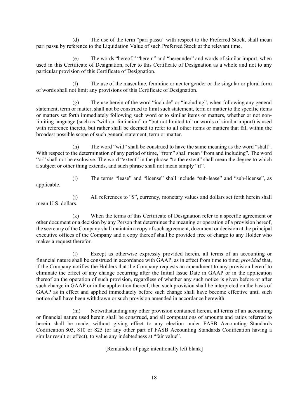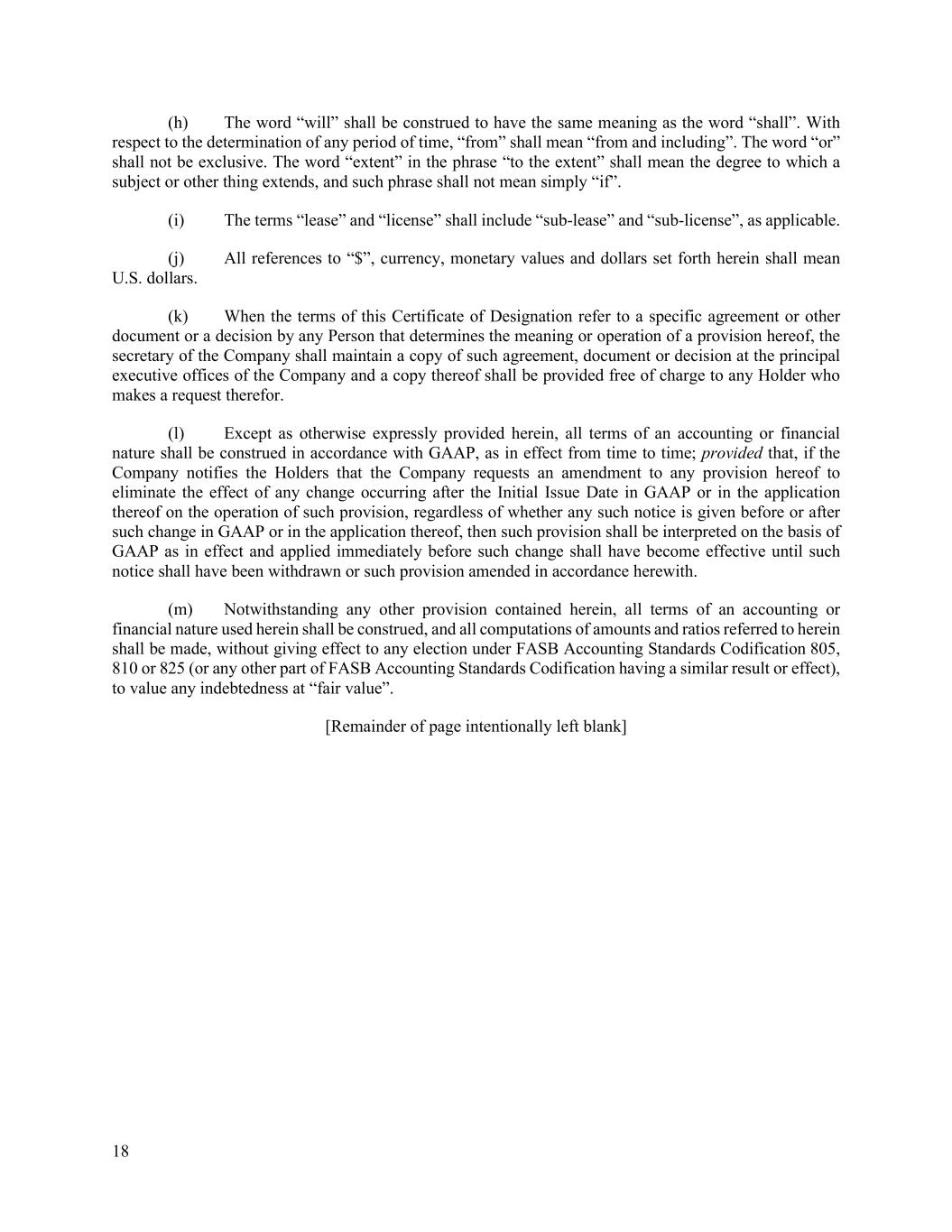 18 (h) The word “will” shall be construed to have the same meaning as the word “shall”. With respect to the determination of any period of time, “from” shall mean “from and including”. The word “or” shall not be exclusive. The word “extent” in the phrase “to the extent” shall mean the degree to which a subject or other thing extends, and such phrase shall not mean simply “if”. (i) The terms “lease” and “license” shall include “sub-lease” and “sub-license”, as applicable. (j) All references to “$”, currency, monetary values and dollars set forth herein shall mean U.S. dollars. (k) When the terms of this Certificate of Designation refer to a specific agreement or other document or a decision by any Person that determines the meaning or operation of a provision hereof, the secretary of the Company shall maintain a copy of such agreement, document or decision at the principal executive offices of the Company and a copy thereof shall be provided free of charge to any Holder who makes a request therefor. (l) Except as otherwise expressly provided herein, all terms of an accounting or financial nature shall be construed in accordance with GAAP, as in effect from time to time; provided that, if the Company notifies the Holders that the Company requests an amendment to any provision hereof to eliminate the effect of any change occurring after the Initial Issue Date in GAAP or in the application thereof on the operation of such provision, regardless of whether any such notice is given before or after such change in GAAP or in the application thereof, then such provision shall be interpreted on the basis of GAAP as in effect and applied immediately before such change shall have become effective until such notice shall have been withdrawn or such provision amended in accordance herewith. (m) Notwithstanding any other provision contained herein, all terms of an accounting or financial nature used herein shall be construed, and all computations of amounts and ratios referred to herein shall be made, without giving effect to any election under FASB Accounting Standards Codification 805, 810 or 825 (or any other part of FASB Accounting Standards Codification having a similar result or effect), to value any indebtedness at “fair value”. [Remainder of page intentionally left blank]