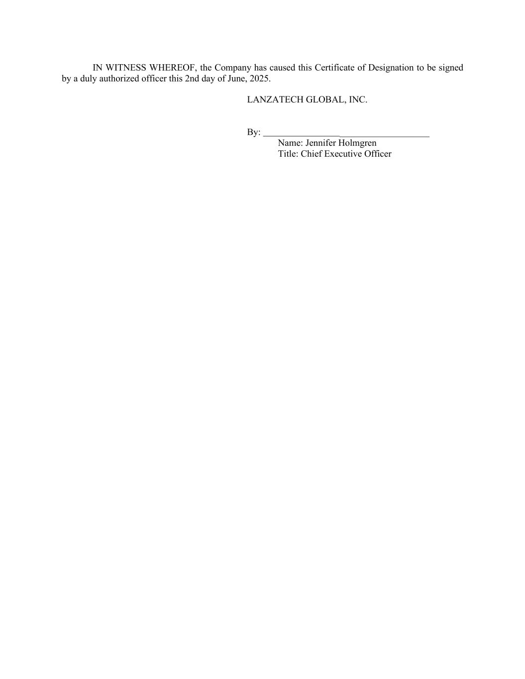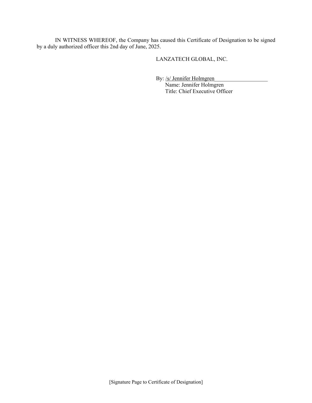 0 IN WITNESS WHEREOF, the Company has caused this Certificate of Designation to be signed by a duly authorized officer this 2nd day of June, 2025. LANZATECH GLOBAL, INC. By: ___________________ Name: Jennifer Holmgren Title: Chief Executive Officer