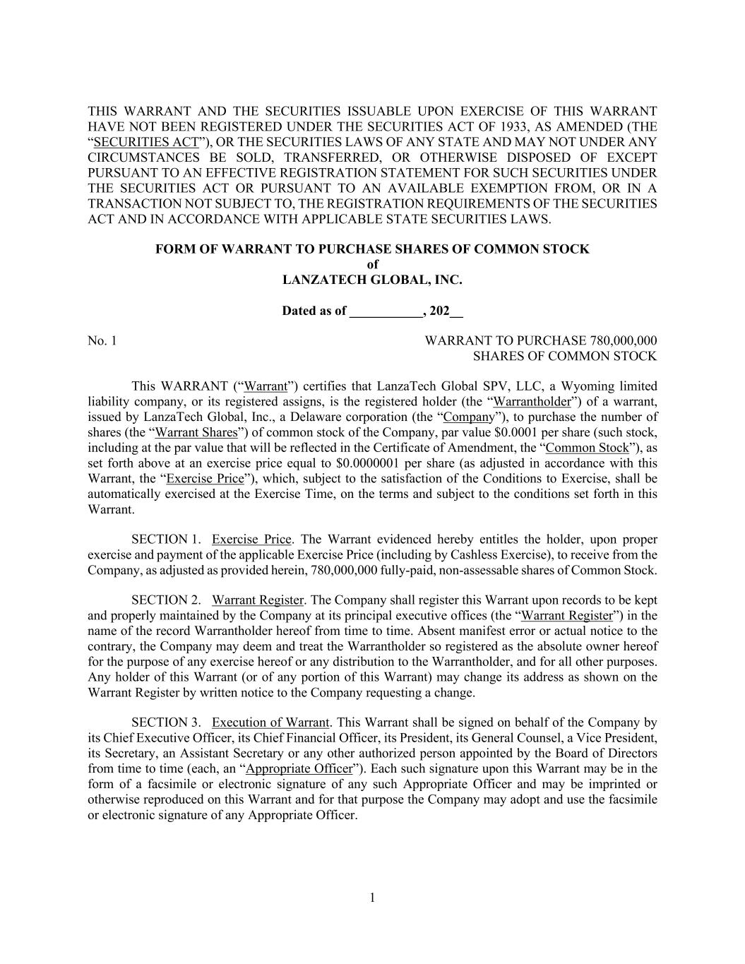 1 THIS WARRANT AND THE SECURITIES ISSUABLE UPON EXERCISE OF THIS WARRANT HAVE NOT BEEN REGISTERED UNDER THE SECURITIES ACT OF 1933, AS AMENDED (THE “SECURITIES ACT”), OR THE SECURITIES LAWS OF ANY STATE AND MAY NOT UNDER ANY CIRCUMSTANCES BE SOLD, TRANSFERRED, OR OTHERWISE DISPOSED OF EXCEPT PURSUANT TO AN EFFECTIVE REGISTRATION STATEMENT FOR SUCH SECURITIES UNDER THE SECURITIES ACT OR PURSUANT TO AN AVAILABLE EXEMPTION FROM, OR IN A TRANSACTION NOT SUBJECT TO, THE REGISTRATION REQUIREMENTS OF THE SECURITIES ACT AND IN ACCORDANCE WITH APPLICABLE STATE SECURITIES LAWS. FORM OF WARRANT TO PURCHASE SHARES OF COMMON STOCK of LANZATECH GLOBAL, INC. Dated as of ___________, 202__ No. 1 WARRANT TO PURCHASE 780,000,000 SHARES OF COMMON STOCK This WARRANT (“Warrant”) certifies that LanzaTech Global SPV, LLC, a Wyoming limited liability company, or its registered assigns, is the registered holder (the “Warrantholder”) of a warrant, issued by LanzaTech Global, Inc., a Delaware corporation (the “Company”), to purchase the number of shares (the “Warrant Shares”) of common stock of the Company, par value $0.0001 per share (such stock, including at the par value that will be reflected in the Certificate of Amendment, the “Common Stock”), as set forth above at an exercise price equal to $0.0000001 per share (as adjusted in accordance with this Warrant, the “Exercise Price”), which, subject to the satisfaction of the Conditions to Exercise, shall be automatically exercised at the Exercise Time, on the terms and subject to the conditions set forth in this Warrant. SECTION 1. Exercise Price. The Warrant evidenced hereby entitles the holder, upon proper exercise and payment of the applicable Exercise Price (including by Cashless Exercise), to receive from the Company, as adjusted as provided herein, 780,000,000 fully-paid, non-assessable shares of Common Stock. SECTION 2. Warrant Register. The Company shall register this Warrant upon records to be kept and properly maintained by the Company at its principal executive offices (the “Warrant Register”) in the name of the record Warrantholder hereof from time to time. Absent manifest error or actual notice to the contrary, the Company may deem and treat the Warrantholder so registered as the absolute owner hereof for the purpose of any exercise hereof or any distribution to the Warrantholder, and for all other purposes. Any holder of this Warrant (or of any portion of this Warrant) may change its address as shown on the Warrant Register by written notice to the Company requesting a change. SECTION 3. Execution of Warrant. This Warrant shall be signed on behalf of the Company by its Chief Executive Officer, its Chief Financial Officer, its President, its General Counsel, a Vice President, its Secretary, an Assistant Secretary or any other authorized person appointed by the Board of Directors from time to time (each, an “Appropriate Officer”). Each such signature upon this Warrant may be in the form of a facsimile or electronic signature of any such Appropriate Officer and may be imprinted or otherwise reproduced on this Warrant and for that purpose the Company may adopt and use the facsimile or electronic signature of any Appropriate Officer.
