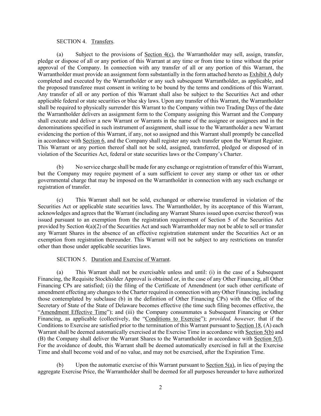 2 SECTION 4. Transfers. (a) Subject to the provisions of Section 4(c), the Warrantholder may sell, assign, transfer, pledge or dispose of all or any portion of this Warrant at any time or from time to time without the prior approval of the Company. In connection with any transfer of all or any portion of this Warrant, the Warrantholder must provide an assignment form substantially in the form attached hereto as Exhibit A duly completed and executed by the Warrantholder or any such subsequent Warrantholder, as applicable, and the proposed transferee must consent in writing to be bound by the terms and conditions of this Warrant. Any transfer of all or any portion of this Warrant shall also be subject to the Securities Act and other applicable federal or state securities or blue sky laws. Upon any transfer of this Warrant, the Warrantholder shall be required to physically surrender this Warrant to the Company within two Trading Days of the date the Warrantholder delivers an assignment form to the Company assigning this Warrant and the Company shall execute and deliver a new Warrant or Warrants in the name of the assignee or assignees and in the denominations specified in such instrument of assignment, shall issue to the Warrantholder a new Warrant evidencing the portion of this Warrant, if any, not so assigned and this Warrant shall promptly be cancelled in accordance with Section 6, and the Company shall register any such transfer upon the Warrant Register. This Warrant or any portion thereof shall not be sold, assigned, transferred, pledged or disposed of in violation of the Securities Act, federal or state securities laws or the Company’s Charter. (b) No service charge shall be made for any exchange or registration of transfer of this Warrant, but the Company may require payment of a sum sufficient to cover any stamp or other tax or other governmental charge that may be imposed on the Warrantholder in connection with any such exchange or registration of transfer. (c) This Warrant shall not be sold, exchanged or otherwise transferred in violation of the Securities Act or applicable state securities laws. The Warrantholder, by its acceptance of this Warrant, acknowledges and agrees that the Warrant (including any Warrant Shares issued upon exercise thereof) was issued pursuant to an exemption from the registration requirement of Section 5 of the Securities Act provided by Section 4(a)(2) of the Securities Act and such Warrantholder may not be able to sell or transfer any Warrant Shares in the absence of an effective registration statement under the Securities Act or an exemption from registration thereunder. This Warrant will not be subject to any restrictions on transfer other than those under applicable securities laws. SECTION 5. Duration and Exercise of Warrant. (a) This Warrant shall not be exercisable unless and until: (i) in the case of a Subsequent Financing, the Requisite Stockholder Approval is obtained or, in the case of any Other Financing, all Other Financing CPs are satisfied; (ii) the filing of the Certificate of Amendment (or such other certificate of amendment effecting any changes to the Charter required in connection with any Other Financing, including those contemplated by subclause (b) in the definition of Other Financing CPs) with the Office of the Secretary of State of the State of Delaware becomes effective (the time such filing becomes effective, the “Amendment Effective Time”); and (iii) the Company consummates a Subsequent Financing or Other Financing, as applicable (collectively, the “Conditions to Exercise”); provided, however, that if the Conditions to Exercise are satisfied prior to the termination of this Warrant pursuant to Section 18, (A) each Warrant shall be deemed automatically exercised at the Exercise Time in accordance with Section 5(b) and (B) the Company shall deliver the Warrant Shares to the Warrantholder in accordance with Section 5(f). For the avoidance of doubt, this Warrant shall be deemed automatically exercised in full at the Exercise Time and shall become void and of no value, and may not be exercised, after the Expiration Time. (b) Upon the automatic exercise of this Warrant pursuant to Section 5(a), in lieu of paying the aggregate Exercise Price, the Warrantholder shall be deemed for all purposes hereunder to have authorized