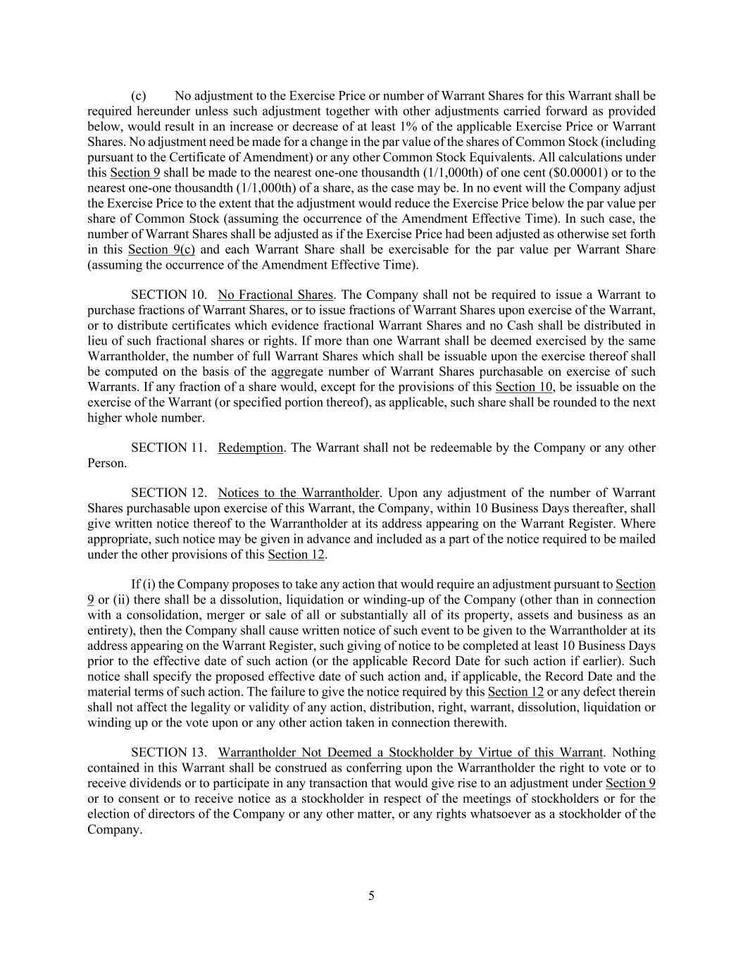 5 (c) No adjustment to the Exercise Price or number of Warrant Shares for this Warrant shall be required hereunder unless such adjustment together with other adjustments carried forward as provided below, would result in an increase or decrease of at least 1% of the applicable Exercise Price or Warrant Shares. No adjustment need be made for a change in the par value of the shares of Common Stock (including pursuant to the Certificate of Amendment) or any other Common Stock Equivalents. All calculations under this Section 9 shall be made to the nearest one-one thousandth (1/1,000th) of one cent ($0.00001) or to the nearest one-one thousandth (1/1,000th) of a share, as the case may be. In no event will the Company adjust the Exercise Price to the extent that the adjustment would reduce the Exercise Price below the par value per share of Common Stock (assuming the occurrence of the Amendment Effective Time). In such case, the number of Warrant Shares shall be adjusted as if the Exercise Price had been adjusted as otherwise set forth in this Section 9(c) and each Warrant Share shall be exercisable for the par value per Warrant Share (assuming the occurrence of the Amendment Effective Time). SECTION 10. No Fractional Shares. The Company shall not be required to issue a Warrant to purchase fractions of Warrant Shares, or to issue fractions of Warrant Shares upon exercise of the Warrant, or to distribute certificates which evidence fractional Warrant Shares and no Cash shall be distributed in lieu of such fractional shares or rights. If more than one Warrant shall be deemed exercised by the same Warrantholder, the number of full Warrant Shares which shall be issuable upon the exercise thereof shall be computed on the basis of the aggregate number of Warrant Shares purchasable on exercise of such Warrants. If any fraction of a share would, except for the provisions of this Section 10, be issuable on the exercise of the Warrant (or specified portion thereof), as applicable, such share shall be rounded to the next higher whole number. SECTION 11. Redemption. The Warrant shall not be redeemable by the Company or any other Person. SECTION 12. Notices to the Warrantholder. Upon any adjustment of the number of Warrant Shares purchasable upon exercise of this Warrant, the Company, within 10 Business Days thereafter, shall give written notice thereof to the Warrantholder at its address appearing on the Warrant Register. Where appropriate, such notice may be given in advance and included as a part of the notice required to be mailed under the other provisions of this Section 12. If (i) the Company proposes to take any action that would require an adjustment pursuant to Section 9 or (ii) there shall be a dissolution, liquidation or winding-up of the Company (other than in connection with a consolidation, merger or sale of all or substantially all of its property, assets and business as an entirety), then the Company shall cause written notice of such event to be given to the Warrantholder at its address appearing on the Warrant Register, such giving of notice to be completed at least 10 Business Days prior to the effective date of such action (or the applicable Record Date for such action if earlier). Such notice shall specify the proposed effective date of such action and, if applicable, the Record Date and the material terms of such action. The failure to give the notice required by this Section 12 or any defect therein shall not affect the legality or validity of any action, distribution, right, warrant, dissolution, liquidation or winding up or the vote upon or any other action taken in connection therewith. SECTION 13. Warrantholder Not Deemed a Stockholder by Virtue of this Warrant. Nothing contained in this Warrant shall be construed as conferring upon the Warrantholder the right to vote or to receive dividends or to participate in any transaction that would give rise to an adjustment under Section 9 or to consent or to receive notice as a stockholder in respect of the meetings of stockholders or for the election of directors of the Company or any other matter, or any rights whatsoever as a stockholder of the Company.