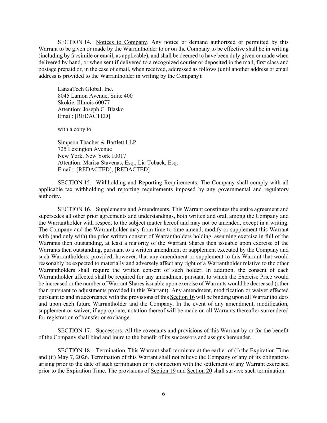 6 SECTION 14. Notices to Company. Any notice or demand authorized or permitted by this Warrant to be given or made by the Warrantholder to or on the Company to be effective shall be in writing (including by facsimile or email, as applicable), and shall be deemed to have been duly given or made when delivered by hand, or when sent if delivered to a recognized courier or deposited in the mail, first class and postage prepaid or, in the case of email, when received, addressed as follows (until another address or email address is provided to the Warrantholder in writing by the Company): LanzaTech Global, Inc. 8045 Lamon Avenue, Suite 400 Skokie, Illinois 60077 Attention: Joseph C. Blasko Email: [REDACTED] with a copy to: Simpson Thacher & Bartlett LLP 725 Lexington Avenue New York, New York 10017 Attention: Marisa Stavenas, Esq., Lia Toback, Esq. Email: [REDACTED], [REDACTED] SECTION 15. Withholding and Reporting Requirements. The Company shall comply with all applicable tax withholding and reporting requirements imposed by any governmental and regulatory authority. SECTION 16. Supplements and Amendments. This Warrant constitutes the entire agreement and supersedes all other prior agreements and understandings, both written and oral, among the Company and the Warrantholder with respect to the subject matter hereof and may not be amended, except in a writing. The Company and the Warrantholder may from time to time amend, modify or supplement this Warrant with (and only with) the prior written consent of Warrantholders holding, assuming exercise in full of the Warrants then outstanding, at least a majority of the Warrant Shares then issuable upon exercise of the Warrants then outstanding, pursuant to a written amendment or supplement executed by the Company and such Warrantholders; provided, however, that any amendment or supplement to this Warrant that would reasonably be expected to materially and adversely affect any right of a Warrantholder relative to the other Warrantholders shall require the written consent of such holder. In addition, the consent of each Warrantholder affected shall be required for any amendment pursuant to which the Exercise Price would be increased or the number of Warrant Shares issuable upon exercise of Warrants would be decreased (other than pursuant to adjustments provided in this Warrant). Any amendment, modification or waiver effected pursuant to and in accordance with the provisions of this Section 16 will be binding upon all Warrantholders and upon each future Warrantholder and the Company. In the event of any amendment, modification, supplement or waiver, if appropriate, notation thereof will be made on all Warrants thereafter surrendered for registration of transfer or exchange. SECTION 17. Successors. All the covenants and provisions of this Warrant by or for the benefit of the Company shall bind and inure to the benefit of its successors and assigns hereunder. SECTION 18. Termination. This Warrant shall terminate at the earlier of (i) the Expiration Time and (ii) May 7, 2026. Termination of this Warrant shall not relieve the Company of any of its obligations arising prior to the date of such termination or in connection with the settlement of any Warrant exercised prior to the Expiration Time. The provisions of Section 19 and Section 20 shall survive such termination.