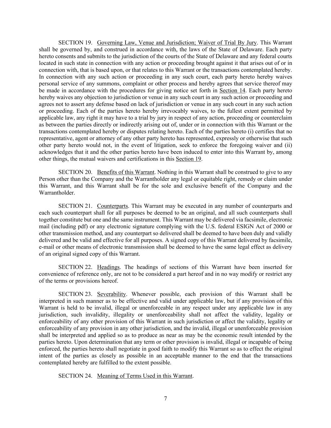 7 SECTION 19. Governing Law, Venue and Jurisdiction; Waiver of Trial By Jury. This Warrant shall be governed by, and construed in accordance with, the laws of the State of Delaware. Each party hereto consents and submits to the jurisdiction of the courts of the State of Delaware and any federal courts located in such state in connection with any action or proceeding brought against it that arises out of or in connection with, that is based upon, or that relates to this Warrant or the transactions contemplated hereby. In connection with any such action or proceeding in any such court, each party hereto hereby waives personal service of any summons, complaint or other process and hereby agrees that service thereof may be made in accordance with the procedures for giving notice set forth in Section 14. Each party hereto hereby waives any objection to jurisdiction or venue in any such court in any such action or proceeding and agrees not to assert any defense based on lack of jurisdiction or venue in any such court in any such action or proceeding. Each of the parties hereto hereby irrevocably waives, to the fullest extent permitted by applicable law, any right it may have to a trial by jury in respect of any action, proceeding or counterclaim as between the parties directly or indirectly arising out of, under or in connection with this Warrant or the transactions contemplated hereby or disputes relating hereto. Each of the parties hereto (i) certifies that no representative, agent or attorney of any other party hereto has represented, expressly or otherwise that such other party hereto would not, in the event of litigation, seek to enforce the foregoing waiver and (ii) acknowledges that it and the other parties hereto have been induced to enter into this Warrant by, among other things, the mutual waivers and certifications in this Section 19. SECTION 20. Benefits of this Warrant. Nothing in this Warrant shall be construed to give to any Person other than the Company and the Warrantholder any legal or equitable right, remedy or claim under this Warrant, and this Warrant shall be for the sole and exclusive benefit of the Company and the Warrantholder. SECTION 21. Counterparts. This Warrant may be executed in any number of counterparts and each such counterpart shall for all purposes be deemed to be an original, and all such counterparts shall together constitute but one and the same instrument. This Warrant may be delivered via facsimile, electronic mail (including pdf) or any electronic signature complying with the U.S. federal ESIGN Act of 2000 or other transmission method, and any counterpart so delivered shall be deemed to have been duly and validly delivered and be valid and effective for all purposes. A signed copy of this Warrant delivered by facsimile, e-mail or other means of electronic transmission shall be deemed to have the same legal effect as delivery of an original signed copy of this Warrant. SECTION 22. Headings. The headings of sections of this Warrant have been inserted for convenience of reference only, are not to be considered a part hereof and in no way modify or restrict any of the terms or provisions hereof. SECTION 23. Severability. Whenever possible, each provision of this Warrant shall be interpreted in such manner as to be effective and valid under applicable law, but if any provision of this Warrant is held to be invalid, illegal or unenforceable in any respect under any applicable law in any jurisdiction, such invalidity, illegality or unenforceability shall not affect the validity, legality or enforceability of any other provision of this Warrant in such jurisdiction or affect the validity, legality or enforceability of any provision in any other jurisdiction, and the invalid, illegal or unenforceable provision shall be interpreted and applied so as to produce as near as may be the economic result intended by the parties hereto. Upon determination that any term or other provision is invalid, illegal or incapable of being enforced, the parties hereto shall negotiate in good faith to modify this Warrant so as to effect the original intent of the parties as closely as possible in an acceptable manner to the end that the transactions contemplated hereby are fulfilled to the extent possible. SECTION 24. Meaning of Terms Used in this Warrant.