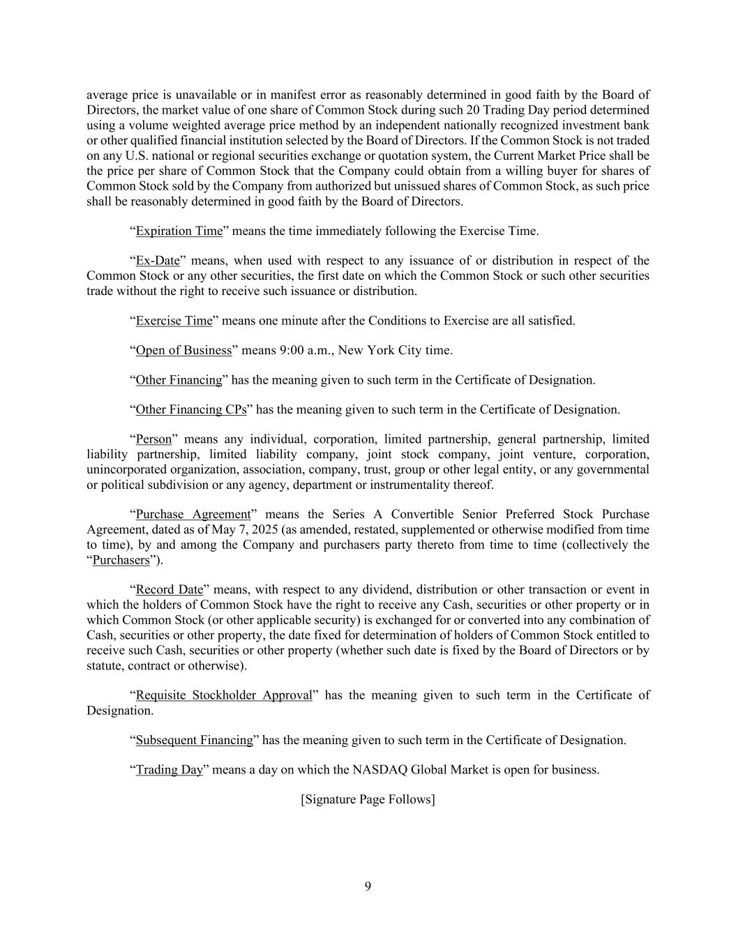 9 average price is unavailable or in manifest error as reasonably determined in good faith by the Board of Directors, the market value of one share of Common Stock during such 20 Trading Day period determined using a volume weighted average price method by an independent nationally recognized investment bank or other qualified financial institution selected by the Board of Directors. If the Common Stock is not traded on any U.S. national or regional securities exchange or quotation system, the Current Market Price shall be the price per share of Common Stock that the Company could obtain from a willing buyer for shares of Common Stock sold by the Company from authorized but unissued shares of Common Stock, as such price shall be reasonably determined in good faith by the Board of Directors. “Expiration Time” means the time immediately following the Exercise Time. “Ex-Date” means, when used with respect to any issuance of or distribution in respect of the Common Stock or any other securities, the first date on which the Common Stock or such other securities trade without the right to receive such issuance or distribution. “Exercise Time” means one minute after the Conditions to Exercise are all satisfied. “Open of Business” means 9:00 a.m., New York City time. “Other Financing” has the meaning given to such term in the Certificate of Designation. “Other Financing CPs” has the meaning given to such term in the Certificate of Designation. “Person” means any individual, corporation, limited partnership, general partnership, limited liability partnership, limited liability company, joint stock company, joint venture, corporation, unincorporated organization, association, company, trust, group or other legal entity, or any governmental or political subdivision or any agency, department or instrumentality thereof. “Purchase Agreement” means the Series A Convertible Senior Preferred Stock Purchase Agreement, dated as of May 7, 2025 (as amended, restated, supplemented or otherwise modified from time to time), by and among the Company and purchasers party thereto from time to time (collectively the “Purchasers”). “Record Date” means, with respect to any dividend, distribution or other transaction or event in which the holders of Common Stock have the right to receive any Cash, securities or other property or in which Common Stock (or other applicable security) is exchanged for or converted into any combination of Cash, securities or other property, the date fixed for determination of holders of Common Stock entitled to receive such Cash, securities or other property (whether such date is fixed by the Board of Directors or by statute, contract or otherwise). “Requisite Stockholder Approval” has the meaning given to such term in the Certificate of Designation. “Subsequent Financing” has the meaning given to such term in the Certificate of Designation. “Trading Day” means a day on which the NASDAQ Global Market is open for business. [Signature Page Follows]