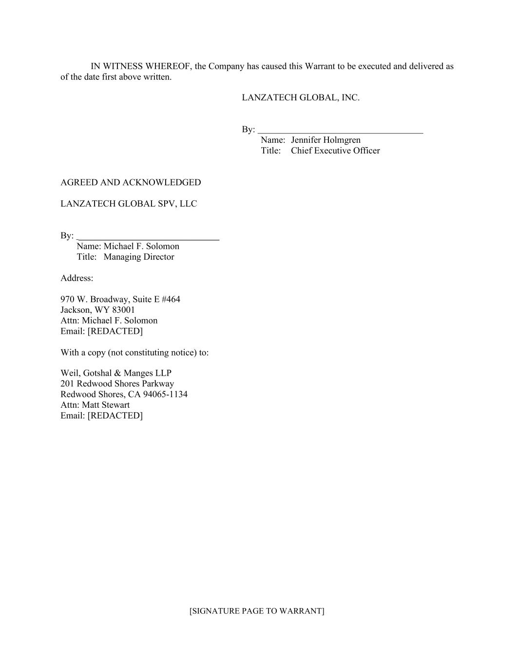 [SIGNATURE PAGE TO WARRANT] IN WITNESS WHEREOF, the Company has caused this Warrant to be executed and delivered as of the date first above written. LANZATECH GLOBAL, INC. By: Name: Jennifer Holmgren Title: Chief Executive Officer AGREED AND ACKNOWLEDGED LANZATECH GLOBAL SPV, LLC By: ________________________________________________ Name: Michael F. Solomon Title: Managing Director Address: 970 W. Broadway, Suite E #464 Jackson, WY 83001 Attn: Michael F. Solomon Email: [REDACTED] With a copy (not constituting notice) to: Weil, Gotshal & Manges LLP 201 Redwood Shores Parkway Redwood Shores, CA 94065-1134 Attn: Matt Stewart Email: [REDACTED]