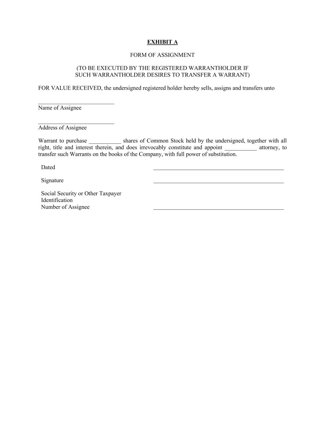 EXHIBIT A FORM OF ASSIGNMENT (TO BE EXECUTED BY THE REGISTERED WARRANTHOLDER IF SUCH WARRANTHOLDER DESIRES TO TRANSFER A WARRANT) FOR VALUE RECEIVED, the undersigned registered holder hereby sells, assigns and transfers unto __________________________ Name of Assignee __________________________ Address of Assignee Warrant to purchase ___________ shares of Common Stock held by the undersigned, together with all right, title and interest therein, and does irrevocably constitute and appoint ___________ attorney, to transfer such Warrants on the books of the Company, with full power of substitution. Dated Signature Social Security or Other Taxpayer Identification Number of Assignee
