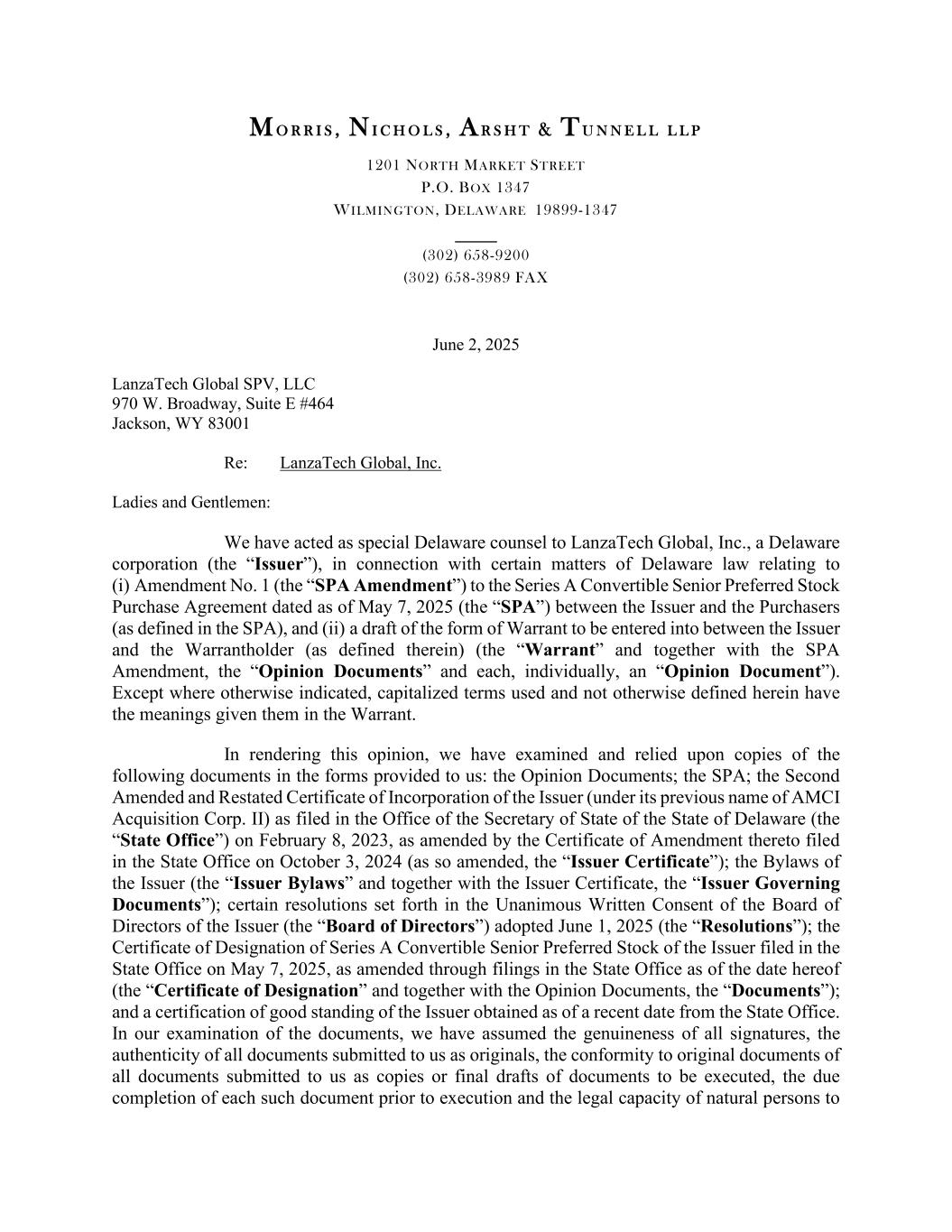 M O R R I S , N I C H O L S , A R S H T & T U N N E L L L L P 1201 NORTH MARKET STREET P.O. BOX 1347 WILMINGTON, DELAWARE 19899-1347 (302) 658-9200 (302) 658-3989 FAX June 2, 2025 LanzaTech Global SPV, LLC 970 W. Broadway, Suite E #464 Jackson, WY 83001 Re: LanzaTech Global, Inc. Ladies and Gentlemen: We have acted as special Delaware counsel to LanzaTech Global, Inc., a Delaware corporation (the “Issuer”), in connection with certain matters of Delaware law relating to (i) Amendment No. 1 (the “SPA Amendment”) to the Series A Convertible Senior Preferred Stock Purchase Agreement dated as of May 7, 2025 (the “SPA”) between the Issuer and the Purchasers (as defined in the SPA), and (ii) a draft of the form of Warrant to be entered into between the Issuer and the Warrantholder (as defined therein) (the “Warrant” and together with the SPA Amendment, the “Opinion Documents” and each, individually, an “Opinion Document”). Except where otherwise indicated, capitalized terms used and not otherwise defined herein have the meanings given them in the Warrant. In rendering this opinion, we have examined and relied upon copies of the following documents in the forms provided to us: the Opinion Documents; the SPA; the Second Amended and Restated Certificate of Incorporation of the Issuer (under its previous name of AMCI Acquisition Corp. II) as filed in the Office of the Secretary of State of the State of Delaware (the “State Office”) on February 8, 2023, as amended by the Certificate of Amendment thereto filed in the State Office on October 3, 2024 (as so amended, the “Issuer Certificate”); the Bylaws of the Issuer (the “Issuer Bylaws” and together with the Issuer Certificate, the “Issuer Governing Documents”); certain resolutions set forth in the Unanimous Written Consent of the Board of Directors of the Issuer (the “Board of Directors”) adopted June 1, 2025 (the “Resolutions”); the Certificate of Designation of Series A Convertible Senior Preferred Stock of the Issuer filed in the State Office on May 7, 2025, as amended through filings in the State Office as of the date hereof (the “Certificate of Designation” and together with the Opinion Documents, the “Documents”); and a certification of good standing of the Issuer obtained as of a recent date from the State Office. In our examination of the documents, we have assumed the genuineness of all signatures, the authenticity of all documents submitted to us as originals, the conformity to original documents of all documents submitted to us as copies or final drafts of documents to be executed, the due completion of each such document prior to execution and the legal capacity of natural persons to