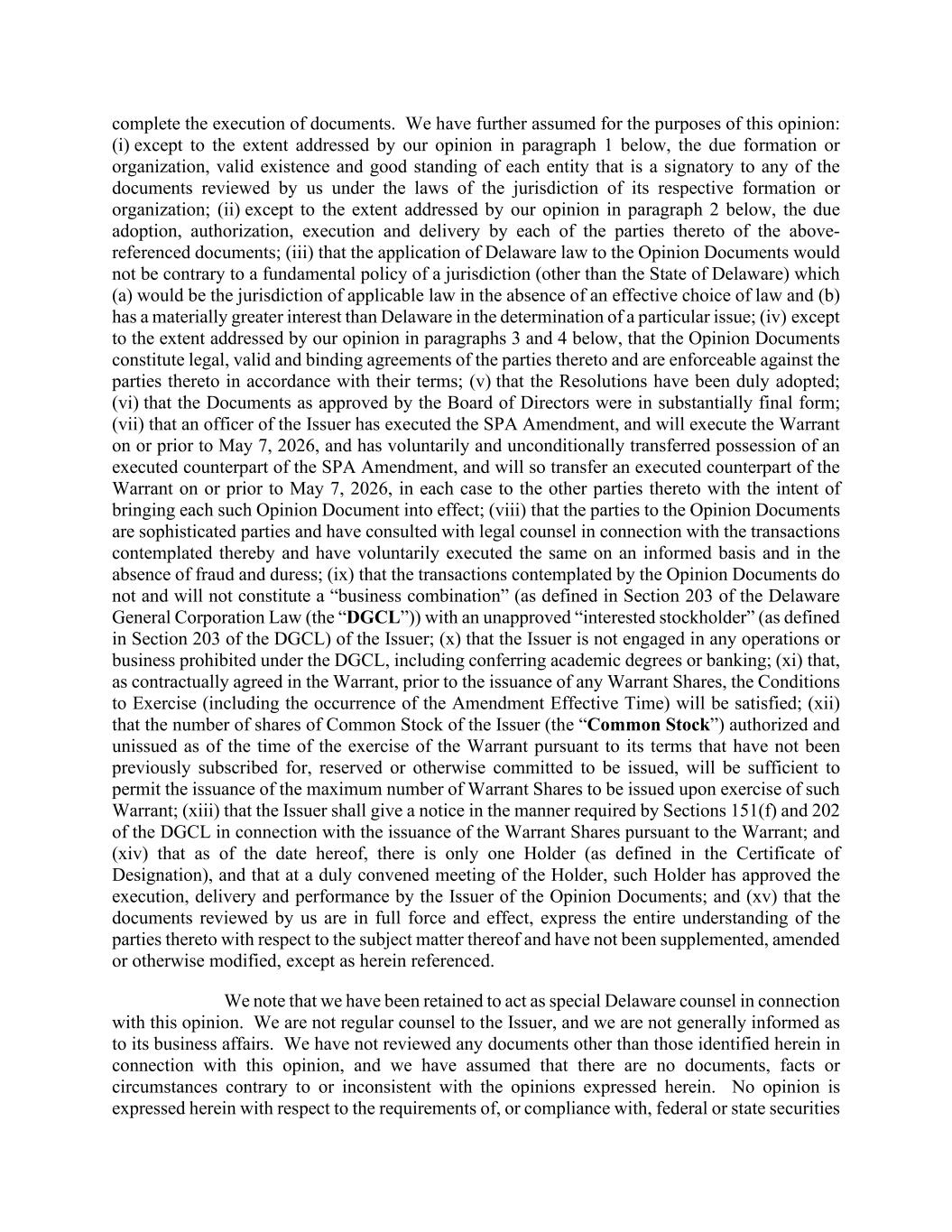 complete the execution of documents. We have further assumed for the purposes of this opinion: (i) except to the extent addressed by our opinion in paragraph 1 below, the due formation or organization, valid existence and good standing of each entity that is a signatory to any of the documents reviewed by us under the laws of the jurisdiction of its respective formation or organization; (ii) except to the extent addressed by our opinion in paragraph 2 below, the due adoption, authorization, execution and delivery by each of the parties thereto of the above- referenced documents; (iii) that the application of Delaware law to the Opinion Documents would not be contrary to a fundamental policy of a jurisdiction (other than the State of Delaware) which (a) would be the jurisdiction of applicable law in the absence of an effective choice of law and (b) has a materially greater interest than Delaware in the determination of a particular issue; (iv) except to the extent addressed by our opinion in paragraphs 3 and 4 below, that the Opinion Documents constitute legal, valid and binding agreements of the parties thereto and are enforceable against the parties thereto in accordance with their terms; (v) that the Resolutions have been duly adopted; (vi) that the Documents as approved by the Board of Directors were in substantially final form; (vii) that an officer of the Issuer has executed the SPA Amendment, and will execute the Warrant on or prior to May 7, 2026, and has voluntarily and unconditionally transferred possession of an executed counterpart of the SPA Amendment, and will so transfer an executed counterpart of the Warrant on or prior to May 7, 2026, in each case to the other parties thereto with the intent of bringing each such Opinion Document into effect; (viii) that the parties to the Opinion Documents are sophisticated parties and have consulted with legal counsel in connection with the transactions contemplated thereby and have voluntarily executed the same on an informed basis and in the absence of fraud and duress; (ix) that the transactions contemplated by the Opinion Documents do not and will not constitute a “business combination” (as defined in Section 203 of the Delaware General Corporation Law (the “DGCL”)) with an unapproved “interested stockholder” (as defined in Section 203 of the DGCL) of the Issuer; (x) that the Issuer is not engaged in any operations or business prohibited under the DGCL, including conferring academic degrees or banking; (xi) that, as contractually agreed in the Warrant, prior to the issuance of any Warrant Shares, the Conditions to Exercise (including the occurrence of the Amendment Effective Time) will be satisfied; (xii) that the number of shares of Common Stock of the Issuer (the “Common Stock”) authorized and unissued as of the time of the exercise of the Warrant pursuant to its terms that have not been previously subscribed for, reserved or otherwise committed to be issued, will be sufficient to permit the issuance of the maximum number of Warrant Shares to be issued upon exercise of such Warrant; (xiii) that the Issuer shall give a notice in the manner required by Sections 151(f) and 202 of the DGCL in connection with the issuance of the Warrant Shares pursuant to the Warrant; and (xiv) that as of the date hereof, there is only one Holder (as defined in the Certificate of Designation), and that at a duly convened meeting of the Holder, such Holder has approved the execution, delivery and performance by the Issuer of the Opinion Documents; and (xv) that the documents reviewed by us are in full force and effect, express the entire understanding of the parties thereto with respect to the subject matter thereof and have not been supplemented, amended or otherwise modified, except as herein referenced. We note that we have been retained to act as special Delaware counsel in connection with this opinion. We are not regular counsel to the Issuer, and we are not generally informed as to its business affairs. We have not reviewed any documents other than those identified herein in connection with this opinion, and we have assumed that there are no documents, facts or circumstances contrary to or inconsistent with the opinions expressed herein. No opinion is expressed herein with respect to the requirements of, or compliance with, federal or state securities