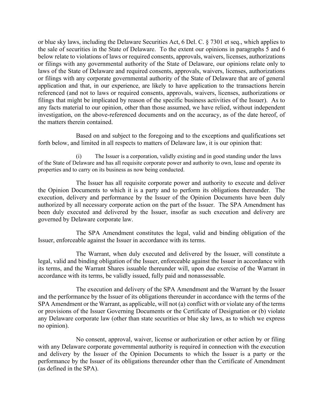 or blue sky laws, including the Delaware Securities Act, 6 Del. C. § 7301 et seq., which applies to the sale of securities in the State of Delaware. To the extent our opinions in paragraphs 5 and 6 below relate to violations of laws or required consents, approvals, waivers, licenses, authorizations or filings with any governmental authority of the State of Delaware, our opinions relate only to laws of the State of Delaware and required consents, approvals, waivers, licenses, authorizations or filings with any corporate governmental authority of the State of Delaware that are of general application and that, in our experience, are likely to have application to the transactions herein referenced (and not to laws or required consents, approvals, waivers, licenses, authorizations or filings that might be implicated by reason of the specific business activities of the Issuer). As to any facts material to our opinion, other than those assumed, we have relied, without independent investigation, on the above-referenced documents and on the accuracy, as of the date hereof, of the matters therein contained. Based on and subject to the foregoing and to the exceptions and qualifications set forth below, and limited in all respects to matters of Delaware law, it is our opinion that: (i) The Issuer is a corporation, validly existing and in good standing under the laws of the State of Delaware and has all requisite corporate power and authority to own, lease and operate its properties and to carry on its business as now being conducted. The Issuer has all requisite corporate power and authority to execute and deliver the Opinion Documents to which it is a party and to perform its obligations thereunder. The execution, delivery and performance by the Issuer of the Opinion Documents have been duly authorized by all necessary corporate action on the part of the Issuer. The SPA Amendment has been duly executed and delivered by the Issuer, insofar as such execution and delivery are governed by Delaware corporate law. The SPA Amendment constitutes the legal, valid and binding obligation of the Issuer, enforceable against the Issuer in accordance with its terms. The Warrant, when duly executed and delivered by the Issuer, will constitute a legal, valid and binding obligation of the Issuer, enforceable against the Issuer in accordance with its terms, and the Warrant Shares issuable thereunder will, upon due exercise of the Warrant in accordance with its terms, be validly issued, fully paid and nonassessable. The execution and delivery of the SPA Amendment and the Warrant by the Issuer and the performance by the Issuer of its obligations thereunder in accordance with the terms of the SPA Amendment or the Warrant, as applicable, will not (a) conflict with or violate any of the terms or provisions of the Issuer Governing Documents or the Certificate of Designation or (b) violate any Delaware corporate law (other than state securities or blue sky laws, as to which we express no opinion). No consent, approval, waiver, license or authorization or other action by or filing with any Delaware corporate governmental authority is required in connection with the execution and delivery by the Issuer of the Opinion Documents to which the Issuer is a party or the performance by the Issuer of its obligations thereunder other than the Certificate of Amendment (as defined in the SPA).