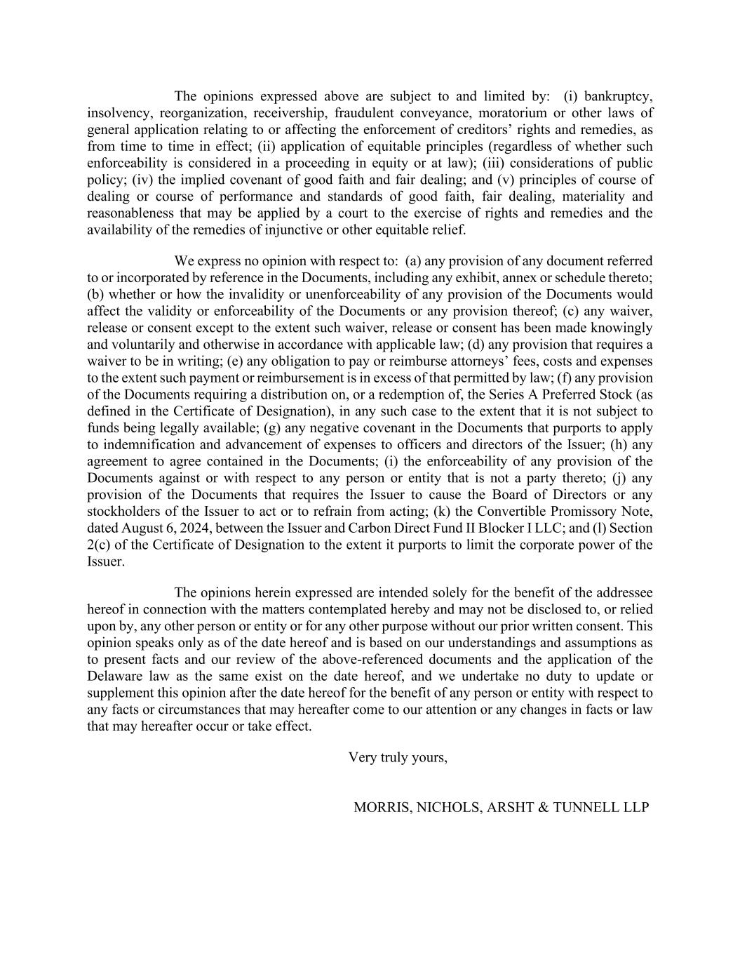 The opinions expressed above are subject to and limited by: (i) bankruptcy, insolvency, reorganization, receivership, fraudulent conveyance, moratorium or other laws of general application relating to or affecting the enforcement of creditors’ rights and remedies, as from time to time in effect; (ii) application of equitable principles (regardless of whether such enforceability is considered in a proceeding in equity or at law); (iii) considerations of public policy; (iv) the implied covenant of good faith and fair dealing; and (v) principles of course of dealing or course of performance and standards of good faith, fair dealing, materiality and reasonableness that may be applied by a court to the exercise of rights and remedies and the availability of the remedies of injunctive or other equitable relief. We express no opinion with respect to: (a) any provision of any document referred to or incorporated by reference in the Documents, including any exhibit, annex or schedule thereto; (b) whether or how the invalidity or unenforceability of any provision of the Documents would affect the validity or enforceability of the Documents or any provision thereof; (c) any waiver, release or consent except to the extent such waiver, release or consent has been made knowingly and voluntarily and otherwise in accordance with applicable law; (d) any provision that requires a waiver to be in writing; (e) any obligation to pay or reimburse attorneys’ fees, costs and expenses to the extent such payment or reimbursement is in excess of that permitted by law; (f) any provision of the Documents requiring a distribution on, or a redemption of, the Series A Preferred Stock (as defined in the Certificate of Designation), in any such case to the extent that it is not subject to funds being legally available; (g) any negative covenant in the Documents that purports to apply to indemnification and advancement of expenses to officers and directors of the Issuer; (h) any agreement to agree contained in the Documents; (i) the enforceability of any provision of the Documents against or with respect to any person or entity that is not a party thereto; (j) any provision of the Documents that requires the Issuer to cause the Board of Directors or any stockholders of the Issuer to act or to refrain from acting; (k) the Convertible Promissory Note, dated August 6, 2024, between the Issuer and Carbon Direct Fund II Blocker I LLC; and (l) Section 2(c) of the Certificate of Designation to the extent it purports to limit the corporate power of the Issuer. The opinions herein expressed are intended solely for the benefit of the addressee hereof in connection with the matters contemplated hereby and may not be disclosed to, or relied upon by, any other person or entity or for any other purpose without our prior written consent. This opinion speaks only as of the date hereof and is based on our understandings and assumptions as to present facts and our review of the above-referenced documents and the application of the Delaware law as the same exist on the date hereof, and we undertake no duty to update or supplement this opinion after the date hereof for the benefit of any person or entity with respect to any facts or circumstances that may hereafter come to our attention or any changes in facts or law that may hereafter occur or take effect. Very truly yours, MORRIS, NICHOLS, ARSHT & TUNNELL LLP