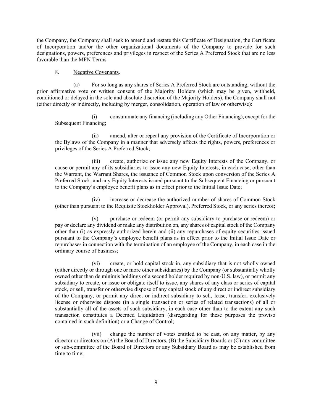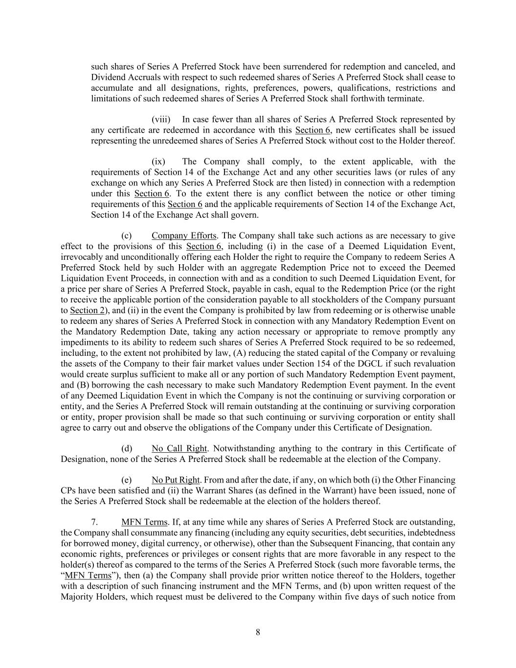 8 there is any conflict between the notice or other timing requirements of this Section 6 and the applicable requirements of Section 14 of the Exchange Act, Section 14 of the Exchange Act shall govern. (c) Company Efforts. The Company shall take such actions as are necessary to give effect to the provisions of this Section 6, including (i) in the case of a Deemed Liquidation Event, irrevocably and unconditionally offering each Holder the right to require the Company to redeem Series A Preferred Stock held by such Holder with an aggregate Redemption Price not to exceed the Deemed Liquidation Event Proceeds, in connection with and as a condition to such Deemed Liquidation Event, for a price per share of Series A Preferred Stock, payable in cash, equal to the Redemption Price (or the right to receive the applicable portion of the consideration payable to all stockholders of the Company pursuant to Section 2), and (ii) in the event the Company is prohibited by law from redeeming or is otherwise unable to redeem any shares of Series A Preferred Stock in connection with any Mandatory Redemption Event on the Mandatory Redemption Date, taking any action necessary or appropriate to remove promptly any impediments to its ability to redeem such shares of Series A Preferred Stock required to be so redeemed, including, to the extent not prohibited by law, (A) reducing the stated capital of the Company or revaluing the assets of the Company to their fair market values under Section 154 of the DGCL if such revaluation would create surplus sufficient to make all or any portion of such Mandatory Redemption Event payment, and (B) borrowing the cash necessary to make such Mandatory Redemption Event payment. In the event of any Deemed Liquidation Event in which the Company is not the continuing or surviving corporation or entity, and the Series A Preferred Stock will remain outstanding at the continuing or surviving corporation or entity, proper provision shall be made so that such continuing or surviving corporation or entity shall agree to carry out and observe the obligations of the Company under this Certificate of Designation. (d) No Call Right. Notwithstanding anything to the contrary in this Certificate of Designation, none of the Series A Preferred Stock shall be redeemable at the election of the Company. (e) No Put Right. From and after the date, if any, on which both (i) the Other Financing CPs have been satisfied and (ii) the Warrant Shares (as defined in the Warrant) have been issued, none of the Series A Preferred Stock shall be redeemable at the election of the holders thereof. SECTION 7. MFN Terms. If, at any time while any shares of Series A Preferred Stock are outstanding, the Company shall consummate any financing (including any equity securities, debt securities, indebtedness for borrowed money, digital currency, or otherwise), other than the Subsequent Financing, that contain any economic rights, preferences or privileges or consent rights that are more favorable in any respect to the holder(s) thereof as compared to the terms of the Series A Preferred Stock (such more favorable terms, the “MFN Terms”), then (a) the Company shall provide prior written notice thereof to the Holders, together with a description of such financing instrument and the MFN Terms, and (b) upon written request of the Majority Holders, which request must be delivered to the Company within five days of such notice from the Company, the Company shall seek to amend and restate this Certificate of Designation, the Certificate of Incorporation and/or the other organizational documents of the Company to provide for such designations, powers, preferences and privileges in respect of the Series A Preferred Stock that are no less favorable than the MFN Terms. SECTION 8. Negative Covenants. (a) For so long as any shares of Series A Preferred Stock are outstanding, without the prior affirmative vote or written consent of the Majority Holders (which may be given, withheld, conditioned or delayed in the sole and absolute discretion of the Majority Holders), the Company shall not (either directly or indirectly, including by merger, consolidation, operation of law or otherwise):