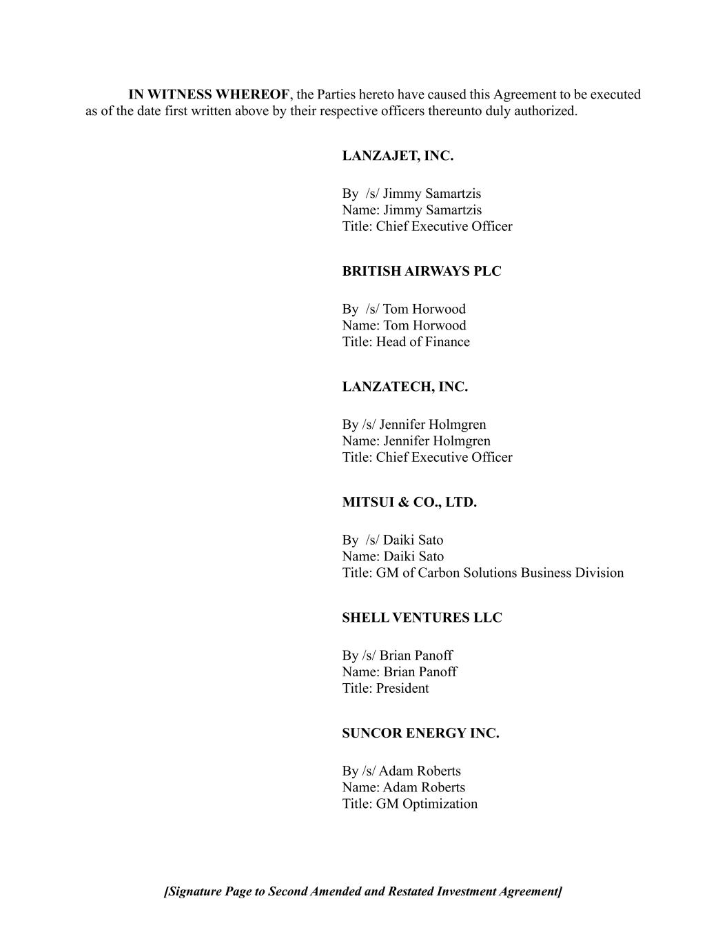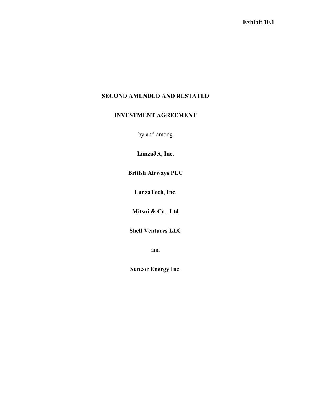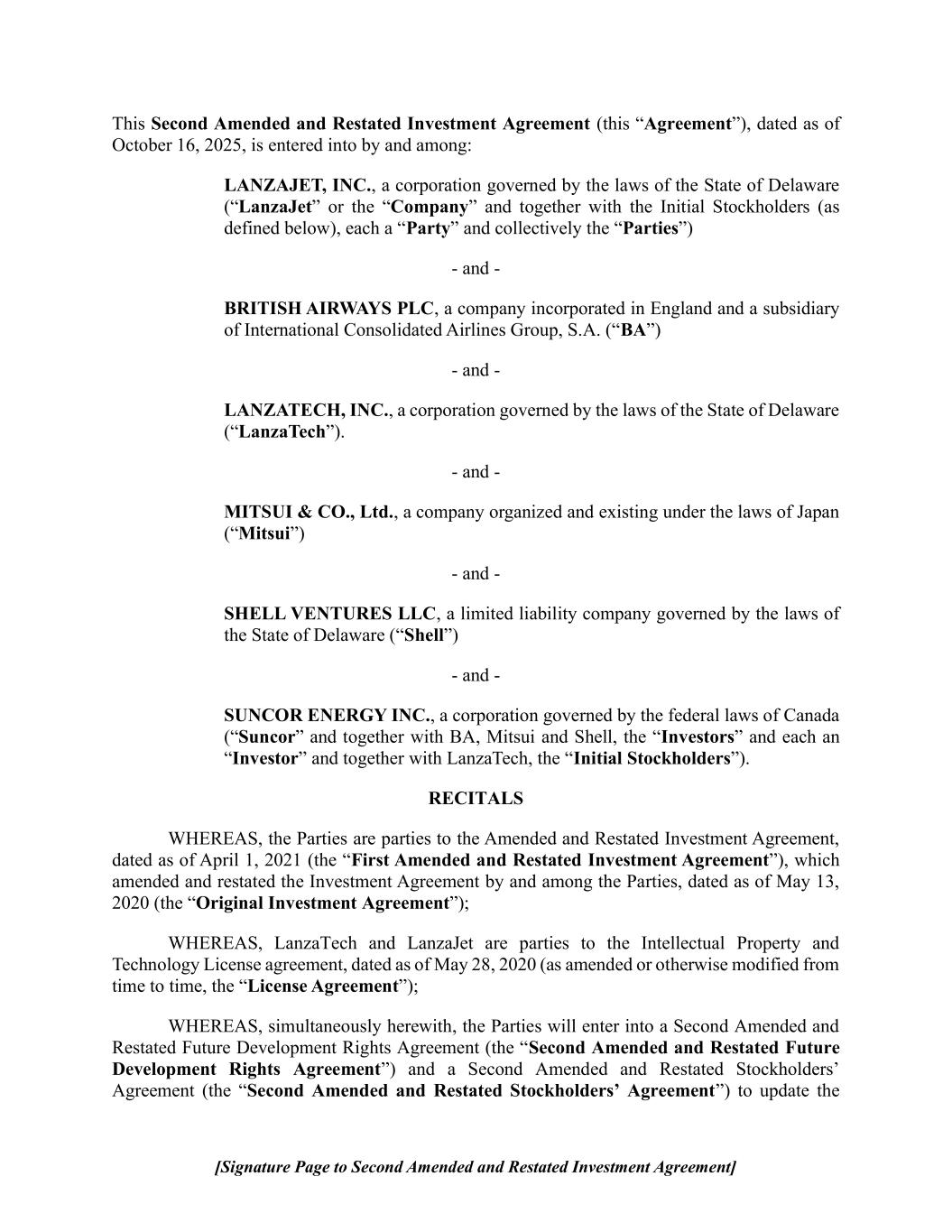 | 10.1*# | | Second Amended and Restated Investment Agreement, dated October 16, 2025, by and among LanzaTech, Inc., LanzaJet, Inc., Mitsui & Co., Ltd., Suncor Energy Inc., British Airways PLC and Shell Ventures LLC. |