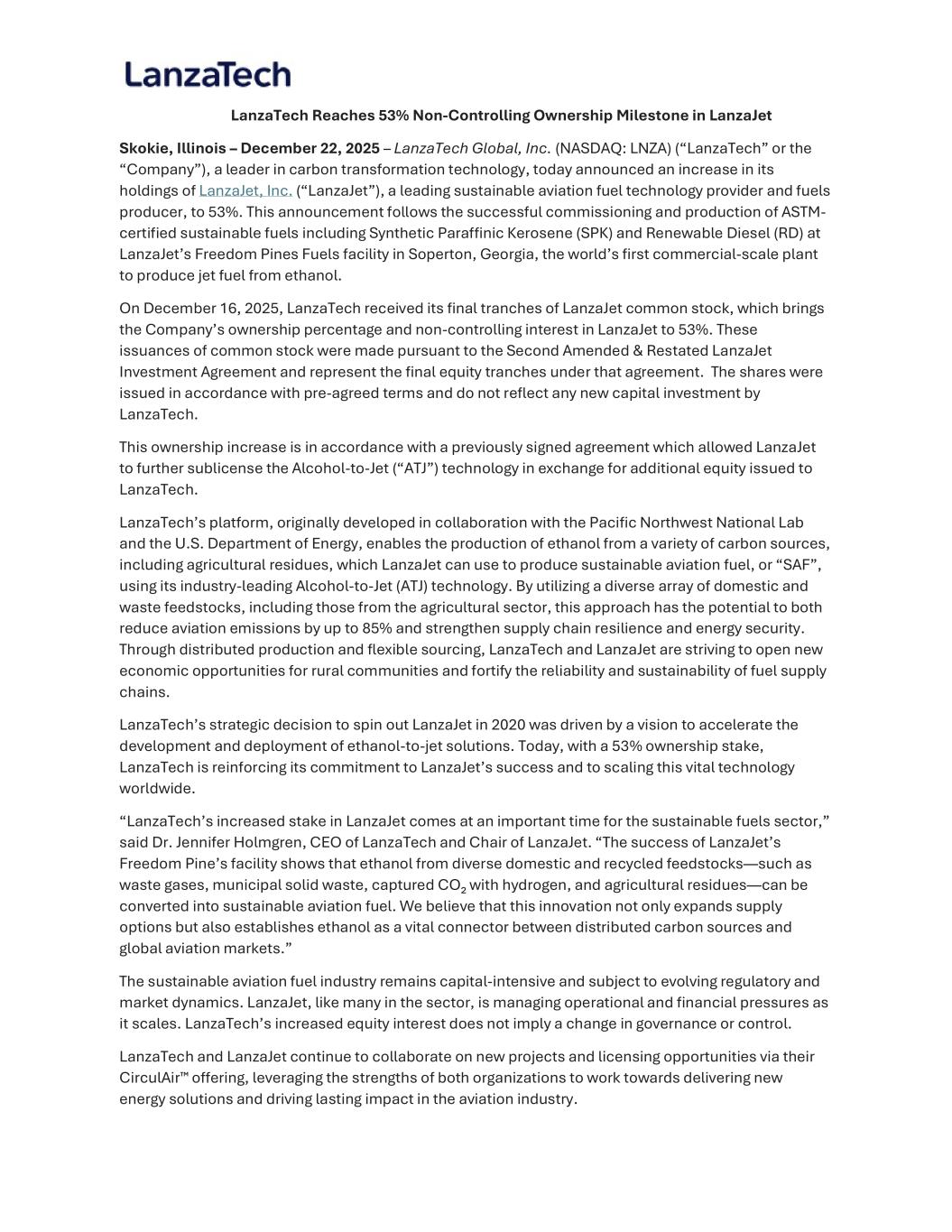 LanzaTech Reaches 53% Non-Controlling Ownership Milestone in LanzaJet Skokie, Illinois – December 22, 2025 – LanzaTech Global, Inc. (NASDAQ: LNZA) (“LanzaTech” or the “Company”), a leader in carbon transformation technology, today announced an increase in its holdings of LanzaJet, Inc. (“LanzaJet”), a leading sustainable aviation fuel technology provider and fuels producer, to 53%. This announcement follows the successful commissioning and production of ASTM- certified sustainable fuels including Synthetic Paraffinic Kerosene (SPK) and Renewable Diesel (RD) at LanzaJet’s Freedom Pines Fuels facility in Soperton, Georgia, the world’s first commercial-scale plant to produce jet fuel from ethanol. On December 16, 2025, LanzaTech received its final tranches of LanzaJet common stock, which brings the Company’s ownership percentage and non-controlling interest in LanzaJet to 53%. These issuances of common stock were made pursuant to the Second Amended & Restated LanzaJet Investment Agreement and represent the final equity tranches under that agreement. The shares were issued in accordance with pre-agreed terms and do not reflect any new capital investment by LanzaTech. This ownership increase is in accordance with a previously signed agreement which allowed LanzaJet to further sublicense the Alcohol-to-Jet (“ATJ”) technology in exchange for additional equity issued to LanzaTech. LanzaTech’s platform, originally developed in collaboration with the Pacific Northwest National Lab and the U.S. Department of Energy, enables the production of ethanol from a variety of carbon sources, including agricultural residues, which LanzaJet can use to produce sustainable aviation fuel, or “SAF”, using its industry-leading Alcohol-to-Jet (ATJ) technology. By utilizing a diverse array of domestic and waste feedstocks, including those from the agricultural sector, this approach has the potential to both reduce aviation emissions by up to 85% and strengthen supply chain resilience and energy security. Through distributed production and flexible sourcing, LanzaTech and LanzaJet are striving to open new economic opportunities for rural communities and fortify the reliability and sustainability of fuel supply chains. LanzaTech’s strategic decision to spin out LanzaJet in 2020 was driven by a vision to accelerate the development and deployment of ethanol-to-jet solutions. Today, with a 53% ownership stake, LanzaTech is reinforcing its commitment to LanzaJet’s success and to scaling this vital technology worldwide. “LanzaTech’s increased stake in LanzaJet comes at an important time for the sustainable fuels sector,” said Dr. Jennifer Holmgren, CEO of LanzaTech and Chair of LanzaJet. “The success of LanzaJet’s Freedom Pine’s facility shows that ethanol from diverse domestic and recycled feedstocks—such as waste gases, municipal solid waste, captured CO₂ with hydrogen, and agricultural residues—can be converted into sustainable aviation fuel. We believe that this innovation not only expands supply options but also establishes ethanol as a vital connector between distributed carbon sources and global aviation markets.” The sustainable aviation fuel industry remains capital-intensive and subject to evolving regulatory and market dynamics. LanzaJet, like many in the sector, is managing operational and financial pressures as it scales. LanzaTech’s increased equity interest does not imply a change in governance or control. LanzaTech and LanzaJet continue to collaborate on new projects and licensing opportunities via their CirculAir™ offering, leveraging the strengths of both organizations to work towards delivering new energy solutions and driving lasting impact in the aviation industry.