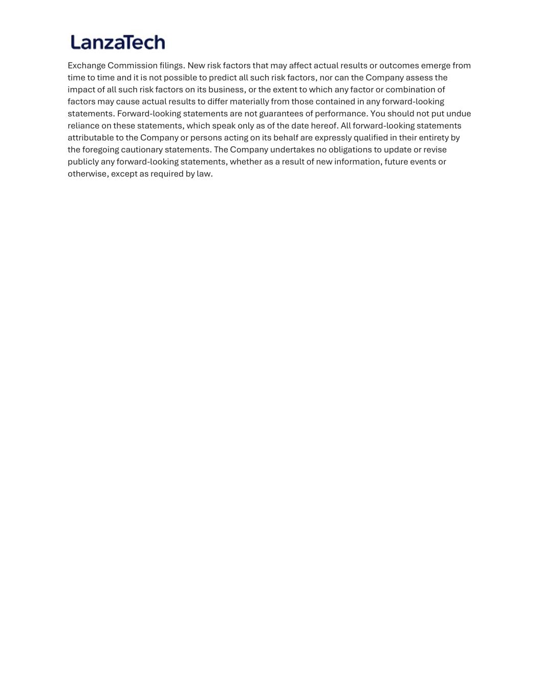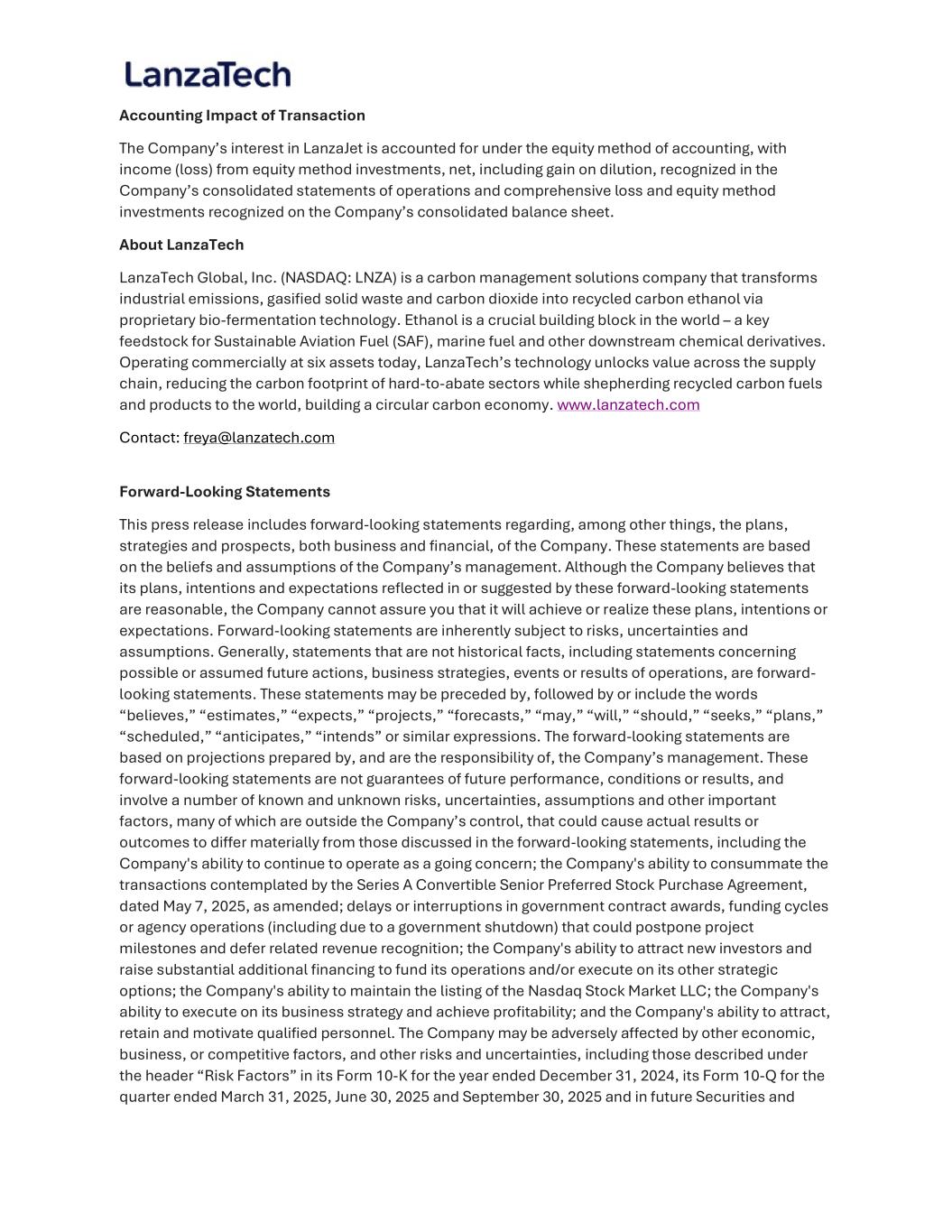 Accounting Impact of Transaction The Company’s interest in LanzaJet is accounted for under the equity method of accounting, with income (loss) from equity method investments, net, including gain on dilution, recognized in the Company’s consolidated statements of operations and comprehensive loss and equity method investments recognized on the Company’s consolidated balance sheet. About LanzaTech LanzaTech Global, Inc. (NASDAQ: LNZA) is a carbon management solutions company that transforms industrial emissions, gasified solid waste and carbon dioxide into recycled carbon ethanol via proprietary bio-fermentation technology. Ethanol is a crucial building block in the world – a key feedstock for Sustainable Aviation Fuel (SAF), marine fuel and other downstream chemical derivatives. Operating commercially at six assets today, LanzaTech’s technology unlocks value across the supply chain, reducing the carbon footprint of hard-to-abate sectors while shepherding recycled carbon fuels and products to the world, building a circular carbon economy. www.lanzatech.com Contact: freya@lanzatech.com Forward-Looking Statements This press release includes forward-looking statements regarding, among other things, the plans, strategies and prospects, both business and financial, of the Company. These statements are based on the beliefs and assumptions of the Company’s management. Although the Company believes that its plans, intentions and expectations reflected in or suggested by these forward-looking statements are reasonable, the Company cannot assure you that it will achieve or realize these plans, intentions or expectations. Forward-looking statements are inherently subject to risks, uncertainties and assumptions. Generally, statements that are not historical facts, including statements concerning possible or assumed future actions, business strategies, events or results of operations, are forward- looking statements. These statements may be preceded by, followed by or include the words “believes,” “estimates,” “expects,” “projects,” “forecasts,” “may,” “will,” “should,” “seeks,” “plans,” “scheduled,” “anticipates,” “intends” or similar expressions. The forward-looking statements are based on projections prepared by, and are the responsibility of, the Company’s management. These forward-looking statements are not guarantees of future performance, conditions or results, and involve a number of known and unknown risks, uncertainties, assumptions and other important factors, many of which are outside the Company’s control, that could cause actual results or outcomes to differ materially from those discussed in the forward-looking statements, including the Company's ability to continue to operate as a going concern; the Company's ability to consummate the transactions contemplated by the Series A Convertible Senior Preferred Stock Purchase Agreement, dated May 7, 2025, as amended; delays or interruptions in government contract awards, funding cycles or agency operations (including due to a government shutdown) that could postpone project milestones and defer related revenue recognition; the Company's ability to attract new investors and raise substantial additional financing to fund its operations and/or execute on its other strategic options; the Company's ability to maintain the listing of the Nasdaq Stock Market LLC; the Company's ability to execute on its business strategy and achieve profitability; and the Company's ability to attract, retain and motivate qualified personnel. The Company may be adversely affected by other economic, business, or competitive factors, and other risks and uncertainties, including those described under the header “Risk Factors” in its Form 10-K for the year ended December 31, 2024, its Form 10-Q for the quarter ended March 31, 2025, June 30, 2025 and September 30, 2025 and in future Securities and
